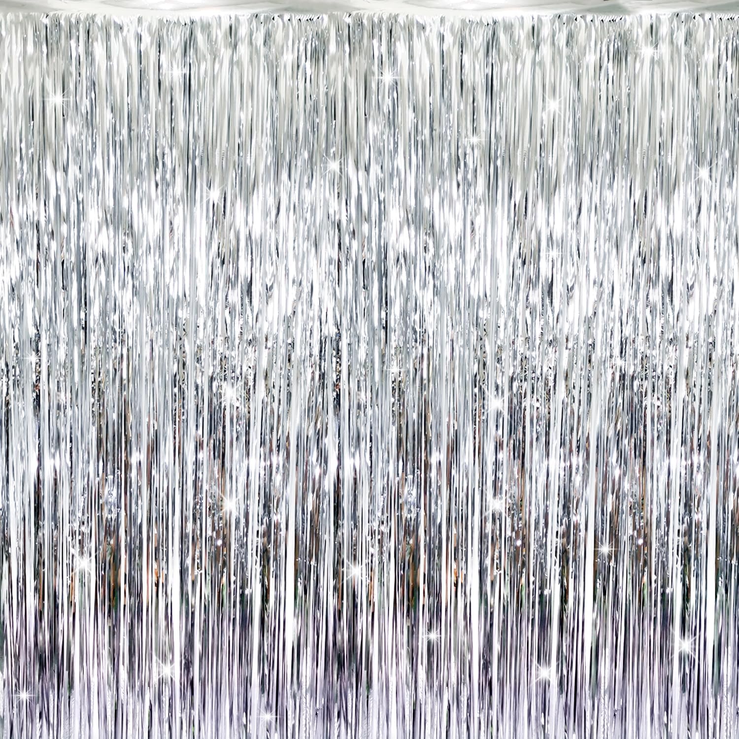 - Package Includes:1 pack silver foil fringe curtain,3.2 ft x9.8 ft each,suitable for hanging on a door or coverage a wall fully