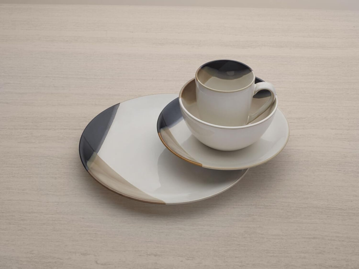 - CONTEMPORARY AND INVITING: Unique black and tan two tone reactive color on product along outside of dinnerware with white glossy center