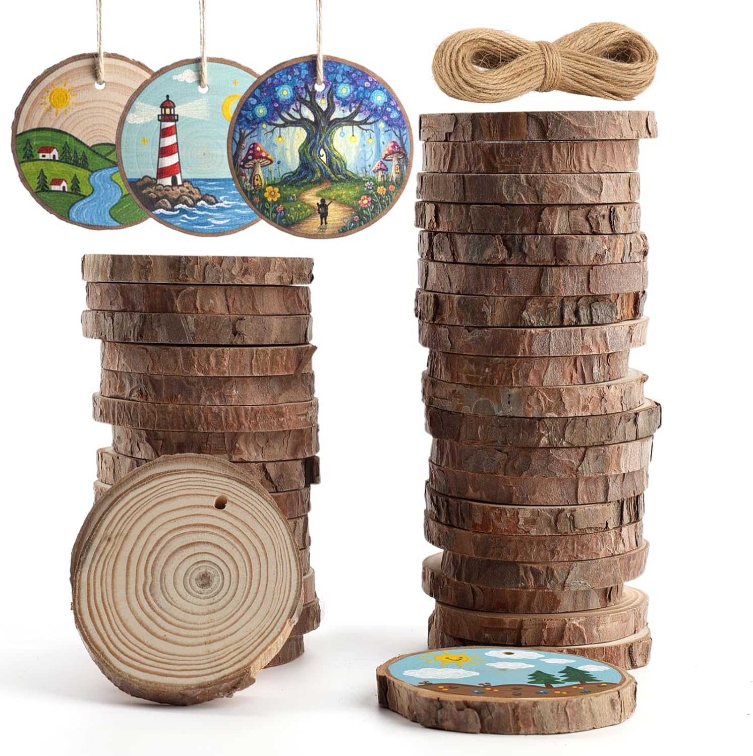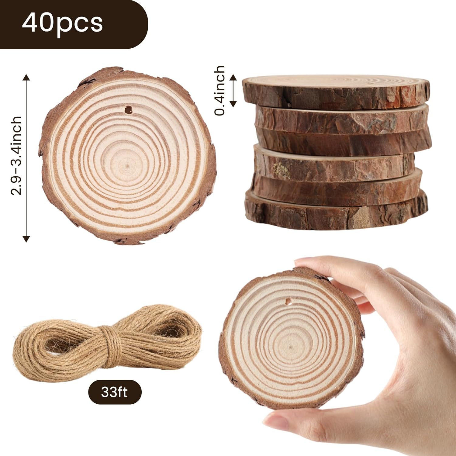 - Package Included: You will receive 40 PCS wood slices with diameters ranging from 2.9 to 3.4 inches and a thickness of 0.4 inches, along with a bundle of 33-foot flax rope. As our wood slices are cut from whole wood, there will be a diameter error of 0.05 to 0.08 inches, but it will not affect your user experience