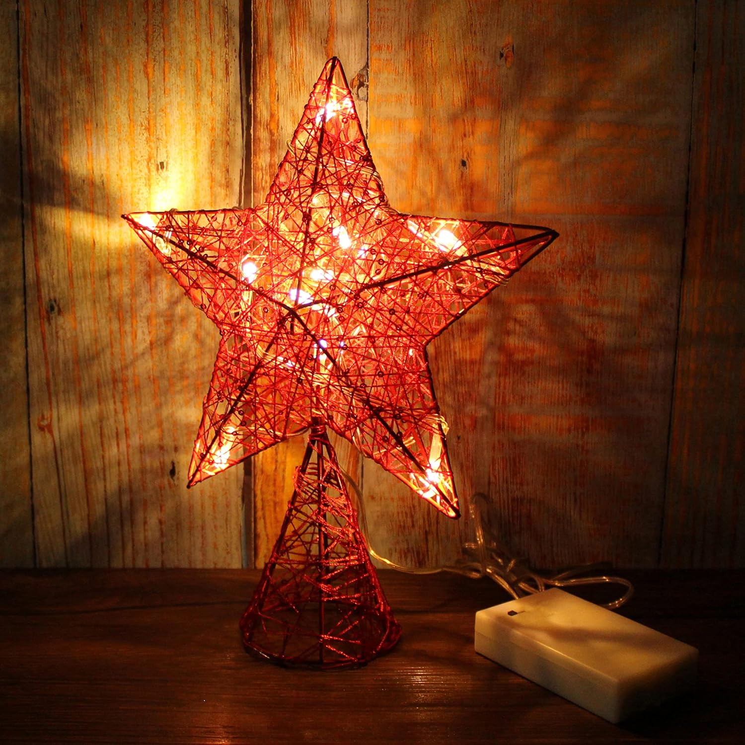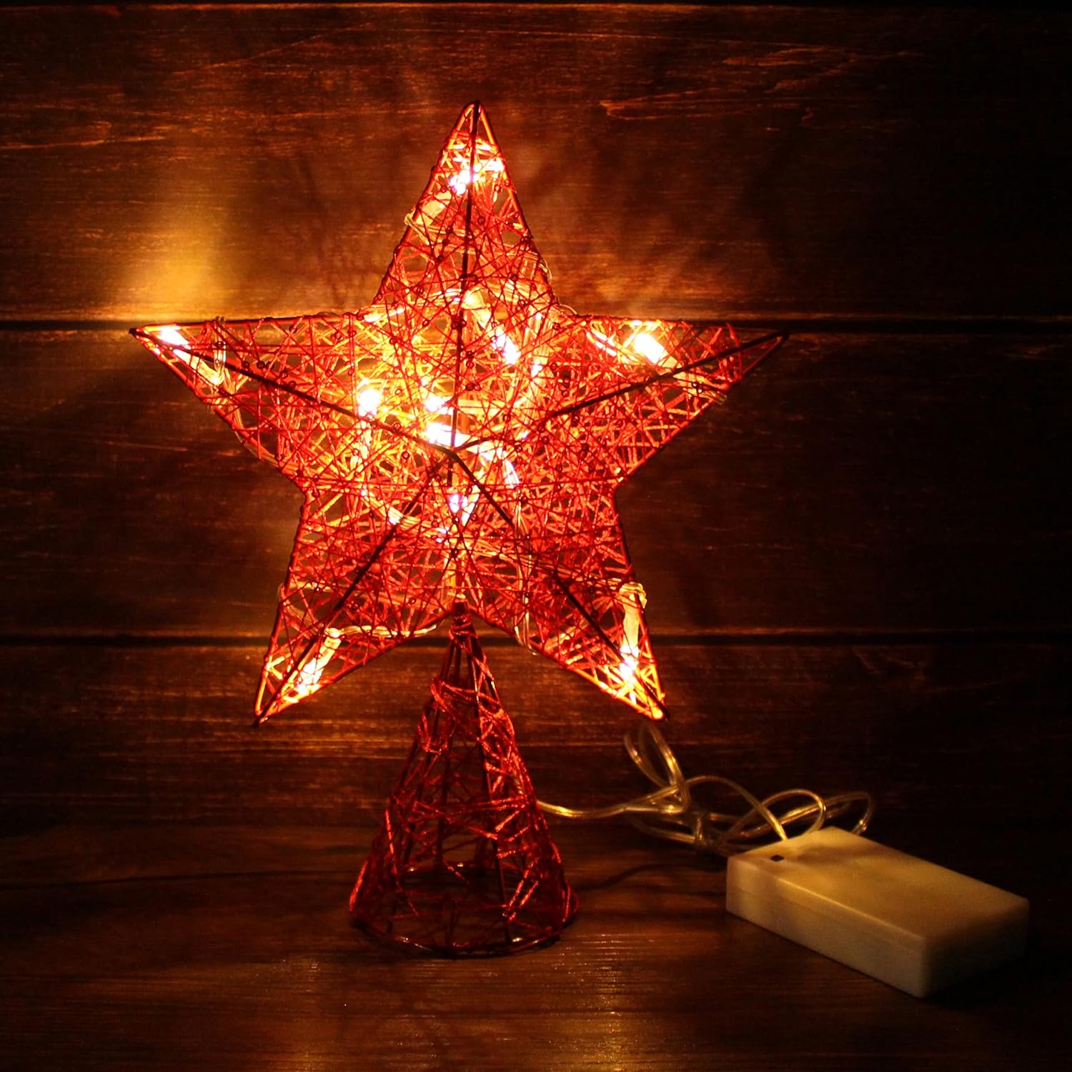 CVHOMEDECO. Red Tree Top Star with Warm White LED Lights and Timer for Christmas Ornaments and Holiday Seasonal Décor, 8 x 10 Inch
