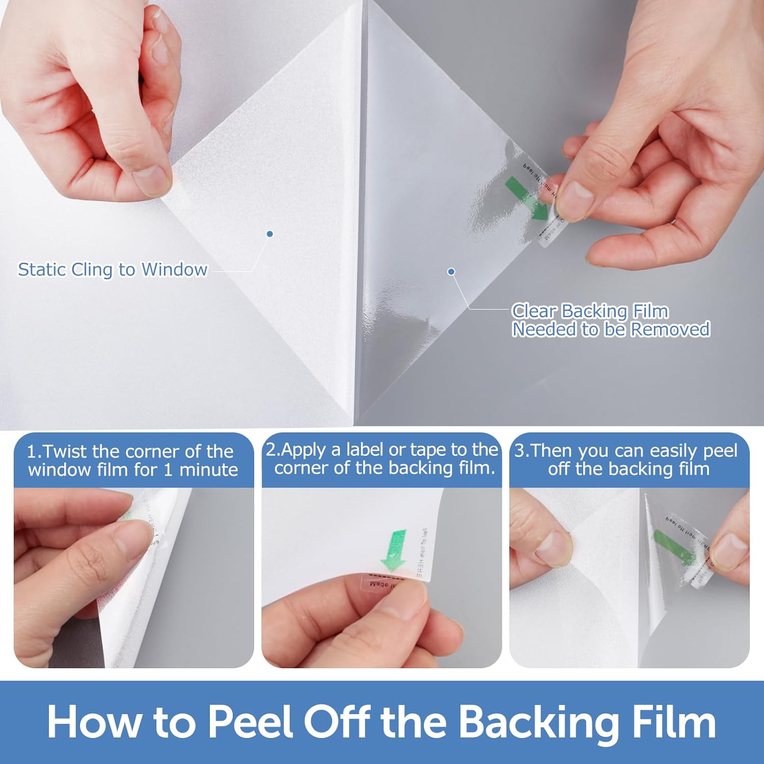 - INSTALLATION TIPS: Before installation, clean the window surface and corners without any dust. During installation, remove the protective backing film and spray plenty of water on the glass surface and smooth side of window film for adhesion. After installation, please trim the edges and leave enough gap between the edge of film and window to easily squeeze out the air bubbles.