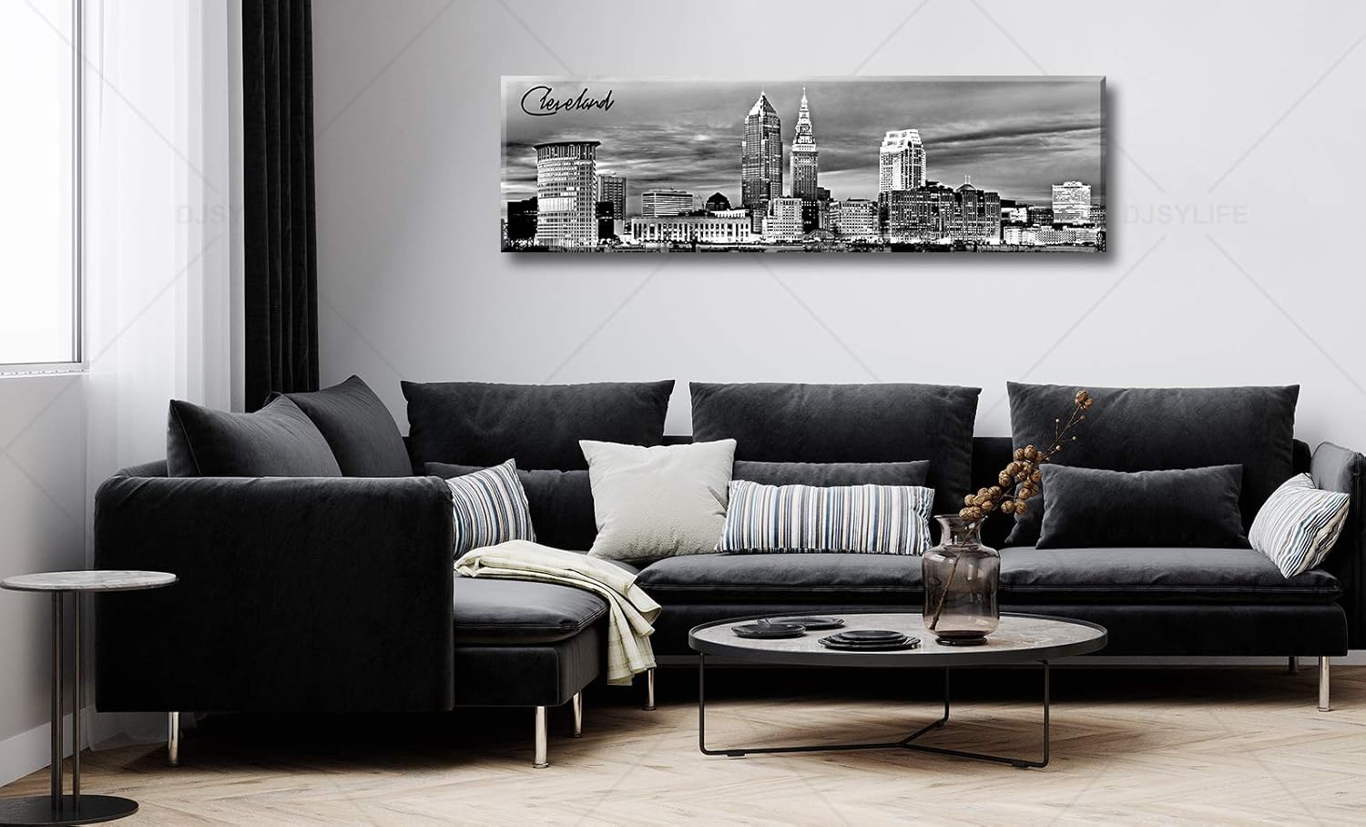 Cleveland Skyline Decor Wall Art Canvas Prints Black and White Night View USA Cityscape Panoramic Painting for Bedroom Office Framed and Ready to Hang 13.8"x47.3"