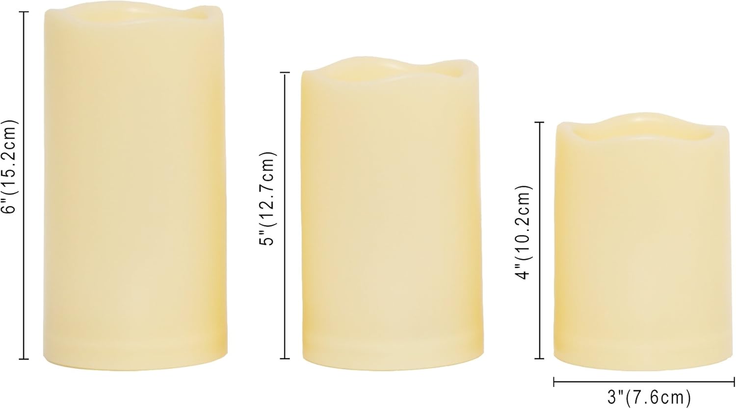 - Remote controlled. Use the remote control to turn on or off these LED flameless pillar candles from a distance up to 20 feet. Remote control is very useful when the plastic pillar candles are difficult to reach or placed in a short distance (less than 20 feet) from you, for example, when these flameless resin candles are put inside outdoor lanterns, on a high rack, a fireplace or a chandelier. One remote controls all three candles.
