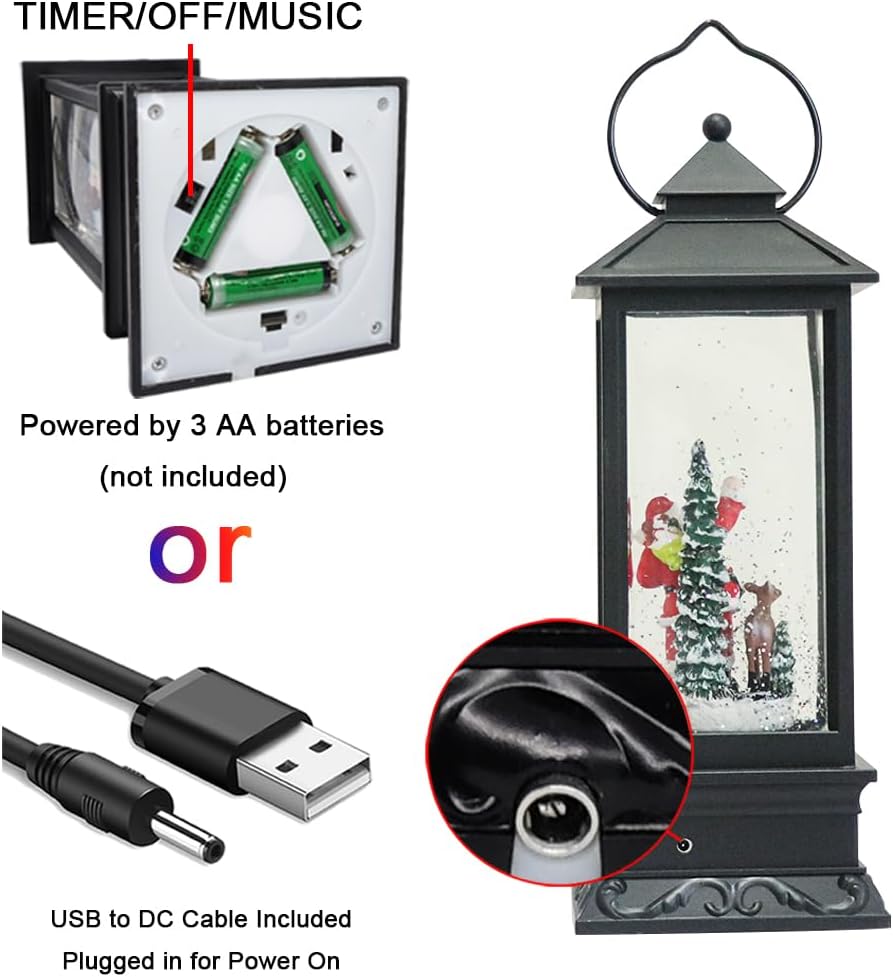 - ★WHAT YOU WILL GET: You will get 1 pcs Water Snow Globe Lantern with Santa Claus figurine in black color finish, which can be operated by USB cord (included) or 3 AA batteries( not included). Product dimension is 4" x 4" x 12"