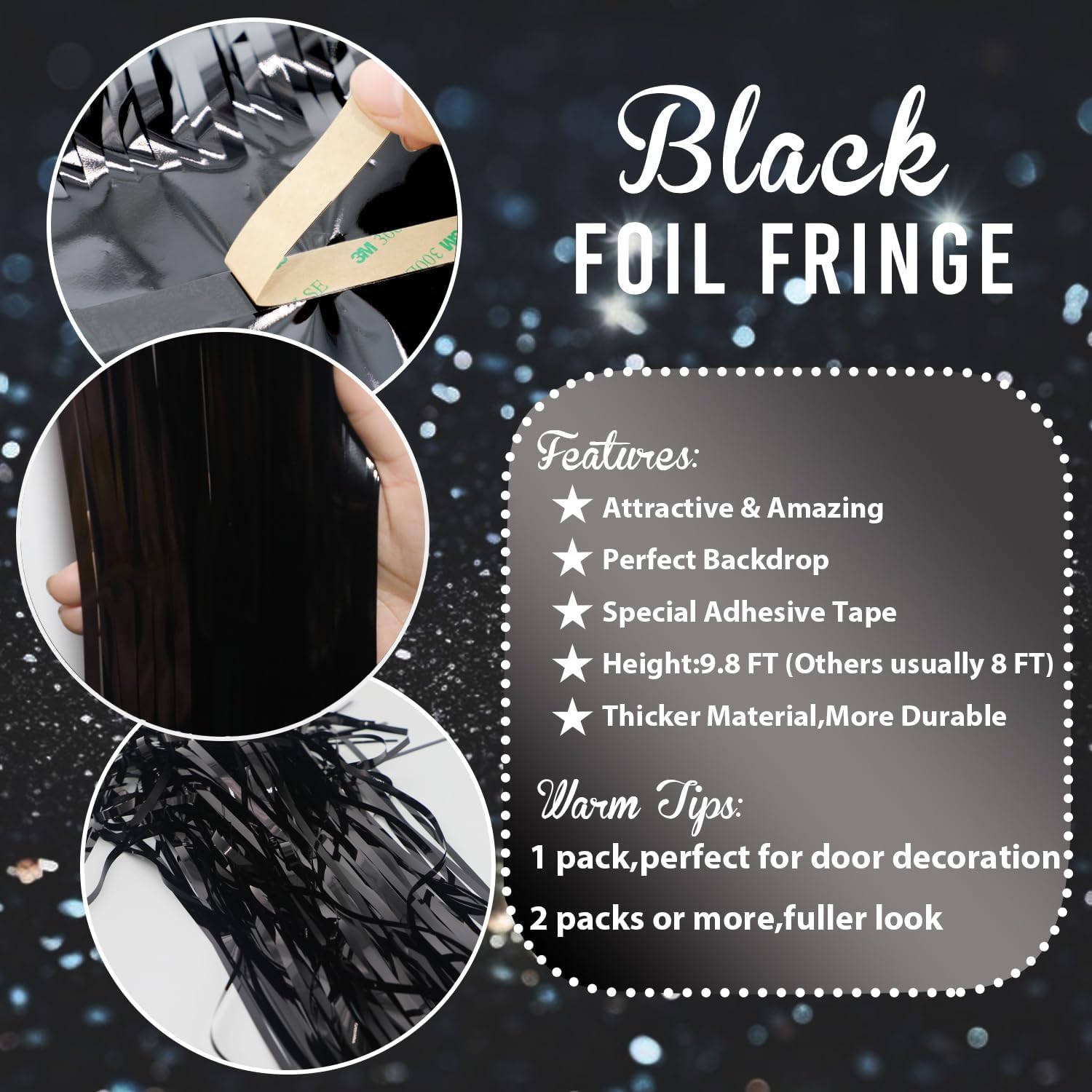 - Package Includes:4 pack black foil fringe curtains,3.2 ft x9.8 ft each,suitable for hanging on a door or coverage a wall fully