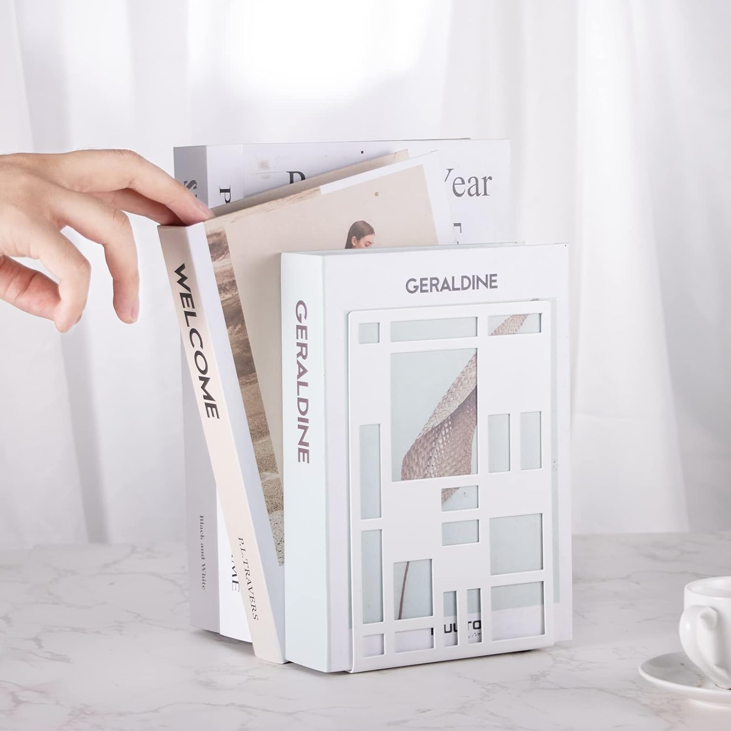 Book Ends, Bookends, Book Ends for Shelves, Bookends for Heavy Books, Book Divider Decorative Holder, Metal Heavy Duty Bookend White 1 Pair, Abstract Art Desgin Book Stopper Supports for Office, Home