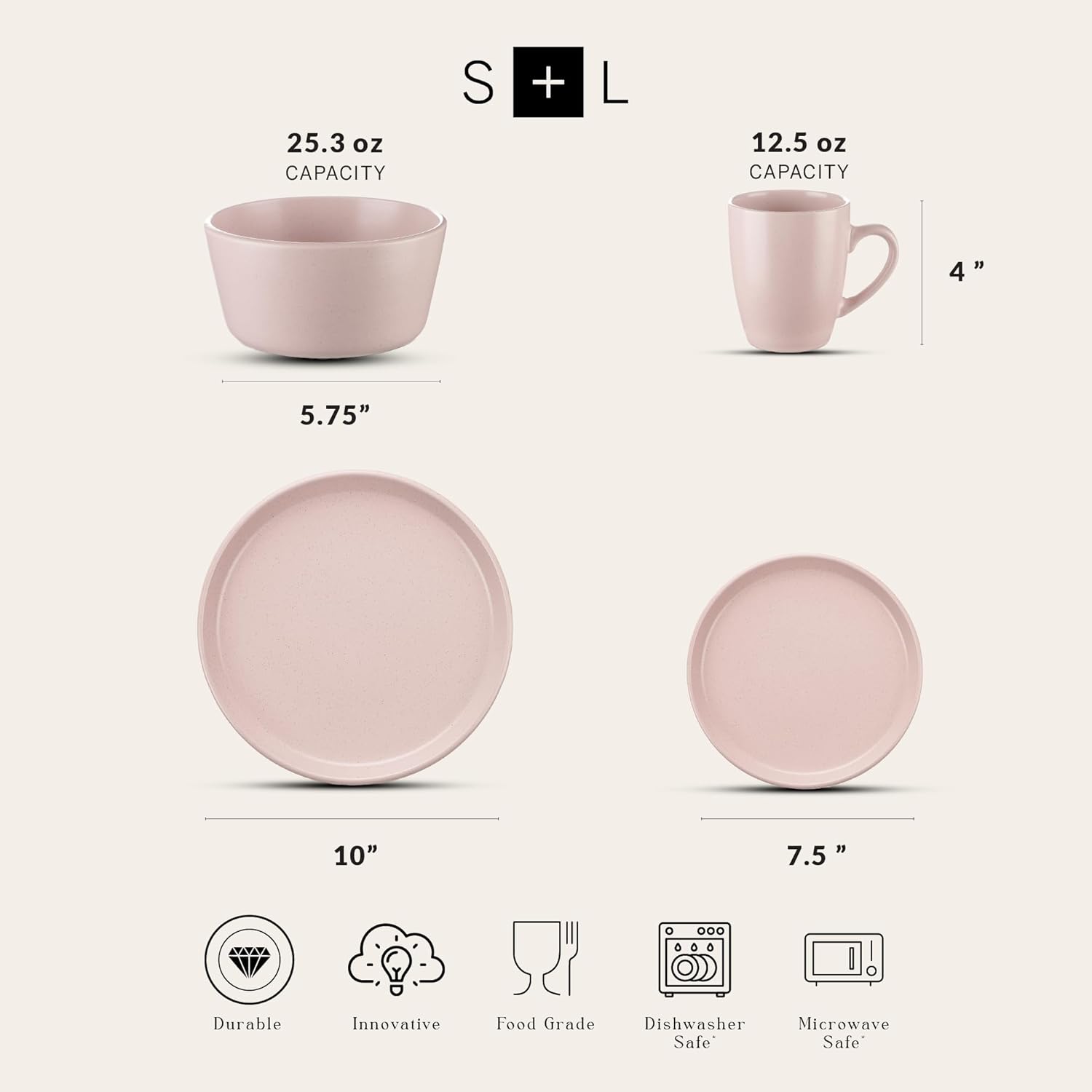 - SERVICE FOR 4: Our Albie Stoneware 16-Piece Round Dish Set includes 4 large round 10” dinner plates, 4 small round 7.5” salad plates, 4 deep round 5.75” bowls, and 4 easy-grip 12.5 fl.oz mugs.