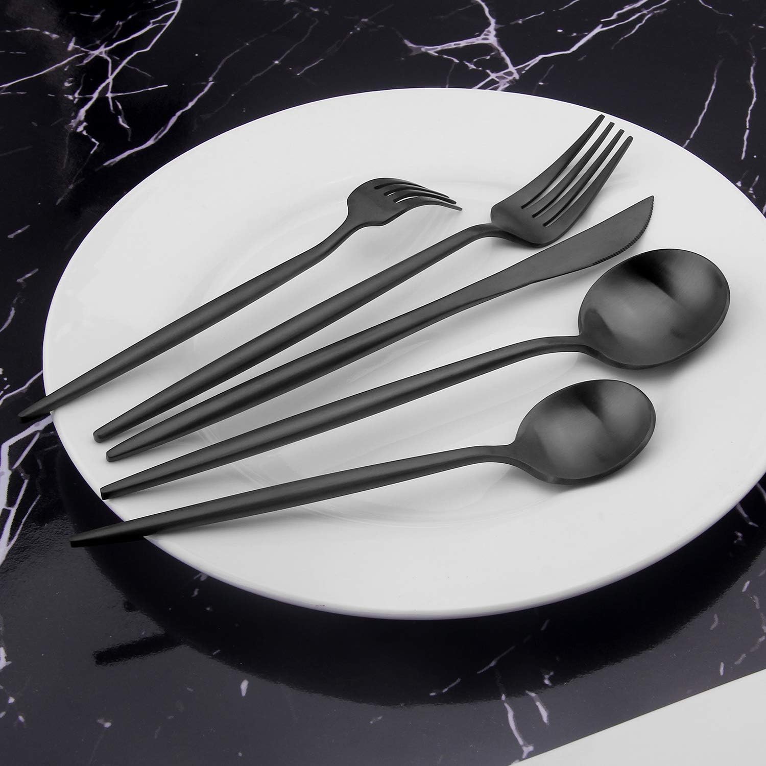 - ā Modern silverware set--This eating utensils sets have the slim profiles and pointed stems, is a sophisticated take on minimalist design. The black kitchen utensils set includes everything you need for a formal full-course meal. They can match your modern dinnerware set and dish set perfectly.