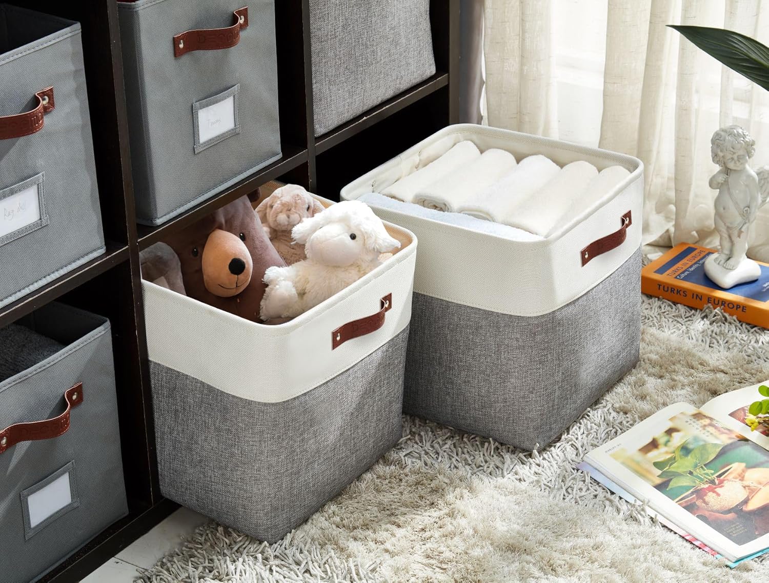 - Durable Cubes Design: DECOMOMO's storage bins feature a sturdy metal frame, extra thick EVA exterior, polyester interior, 2.5mm MDF fiberboard bottom, and faux leather handles capable of holding up to 25 lbs.