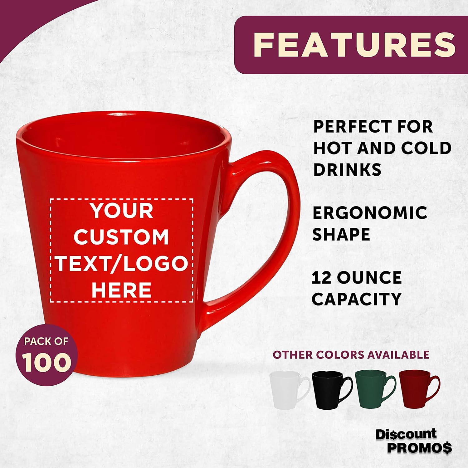 DISCOUNT PROMOS Custom Glossy Ceramic Latte Coffee Mug 12 oz. Set of 100, Personalized Bulk Pack - Perfect for Tea, Espresso, Cappuccino, Hot Cocoa - Red