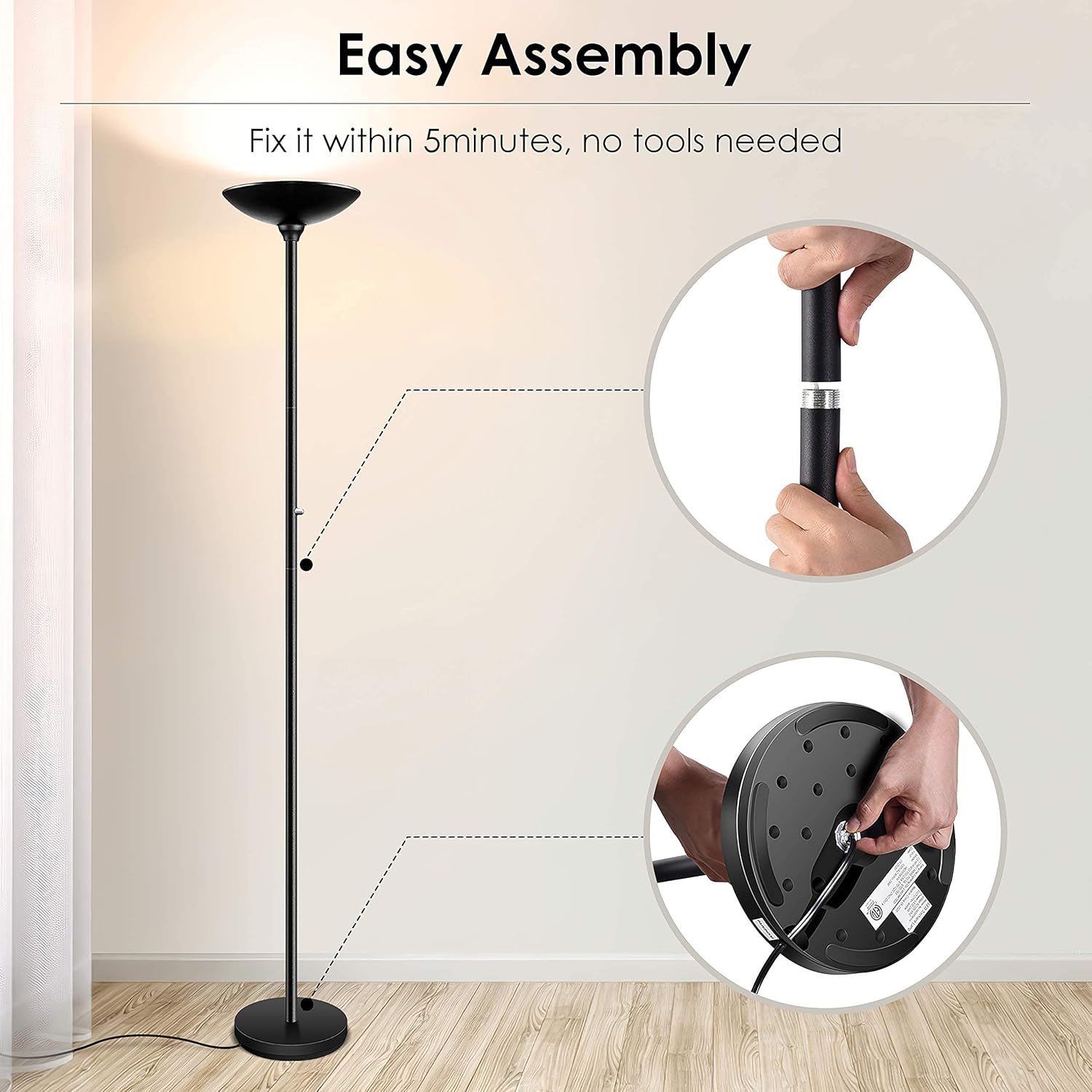 - Easy Assembly; Thanks to our designer years' work of improving the structure, we make the assembly easy than ever; Without tools required, you just need to screw all the parts of the lamp pole together to finish the assembly of this torchiere floor lamp; PS. The instruction is included in the package and the assembly video is attached to the product page