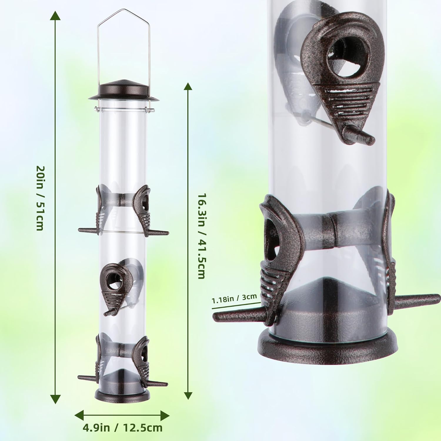 - Dimension of bird feeders for outdoors hanging: The size of tube bird feeders for outdoors hanging is 5 x 5 x 20 inch.You can use outdoor bird feeder easily without installing any tools, and you can also move it freely