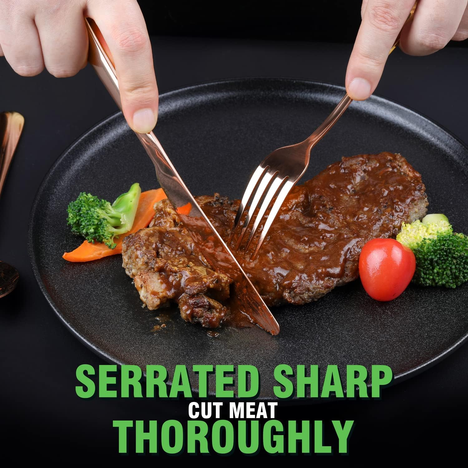 - ăGORGEOUS AND BEAUTIFUL APPEARANCEă: The high-grade mirror polishing process makes the surface of the knife and fork soft and smooth. This copper/rose gold silverware set has good reflective properties, will shine with a copper/rose golden glow to add brilliance to your dining table.
