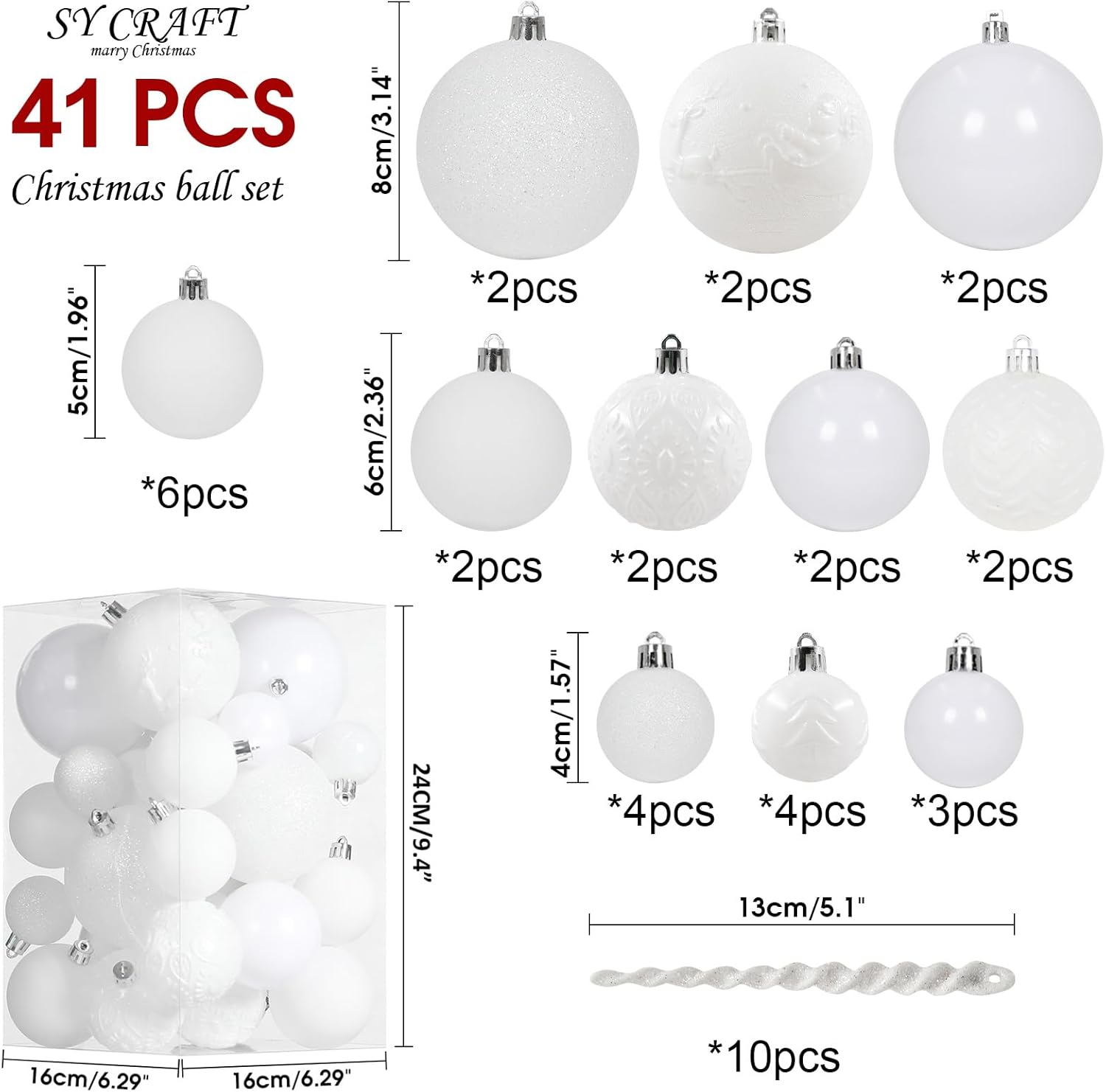 - *[BALL SIZE]The set has 4 extra large balls 3.14", 10 large balls 2.36", 6 medium balls 1.96'', 11 small balls 1.57'', 10 ice bar pendants, Christmas Balls are in 11 Different Colors,Each Barrel Contains 41 Pieces,great to Hang on the Top part or to fill Small Place of Big Trees.