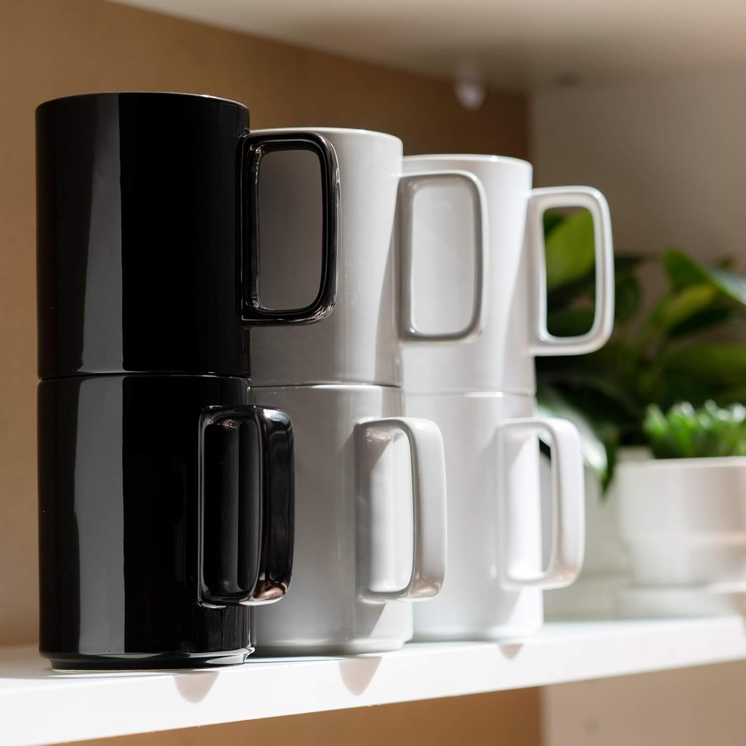 - Clean-lined design in black, white, grey porcelain is ideal for everyday enjoyment of your favorite hot pick-me-up. 15 Ounces capacity is perfect for tea, coffee or hot chocolate.