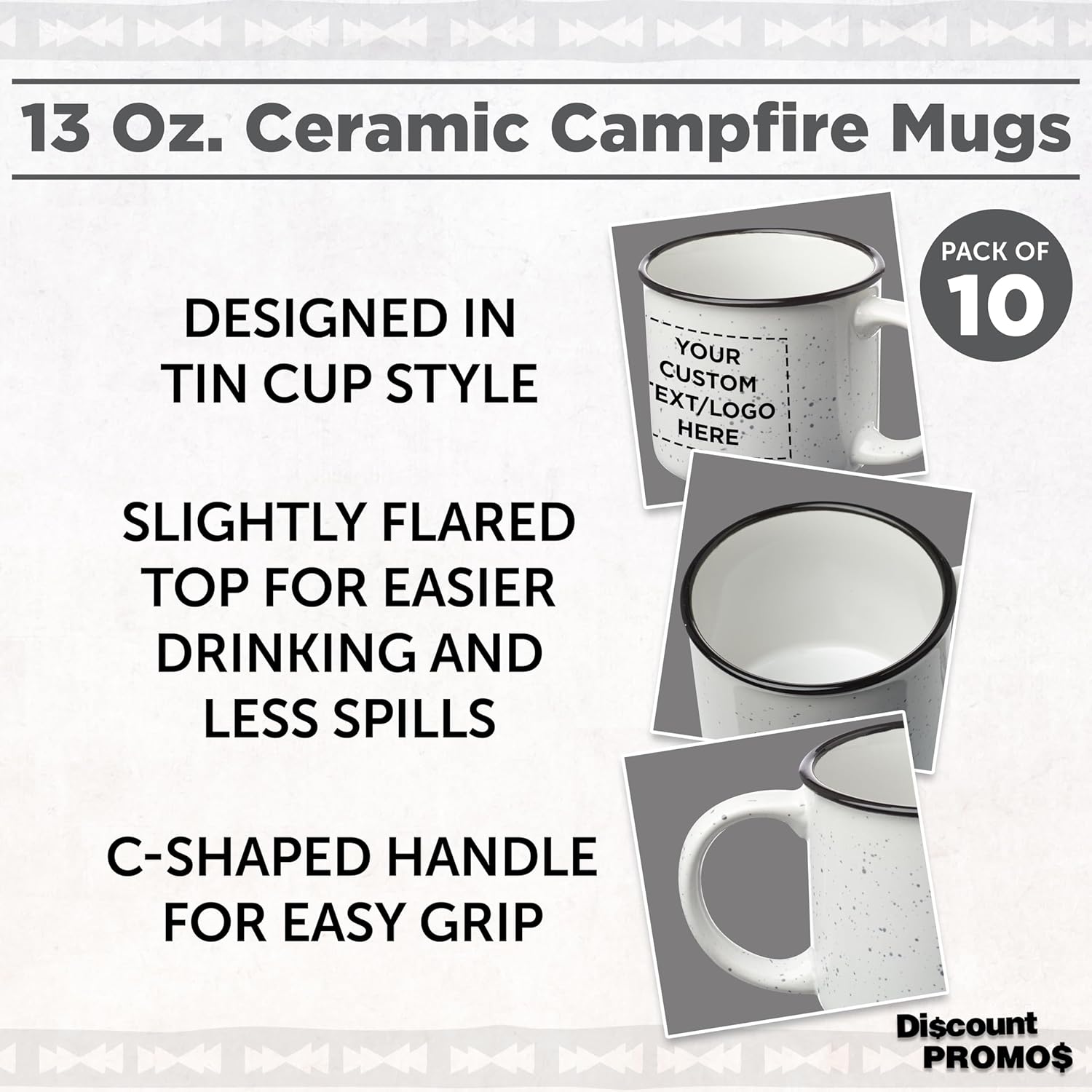 DISCOUNT PROMOS Custom Ceramic Campfire Coffee Mugs 13 oz. Set of 10, Personalized Bulk Pack - Perfect for Tea, Espresso, Cappuccino, Hot Cocoa - White