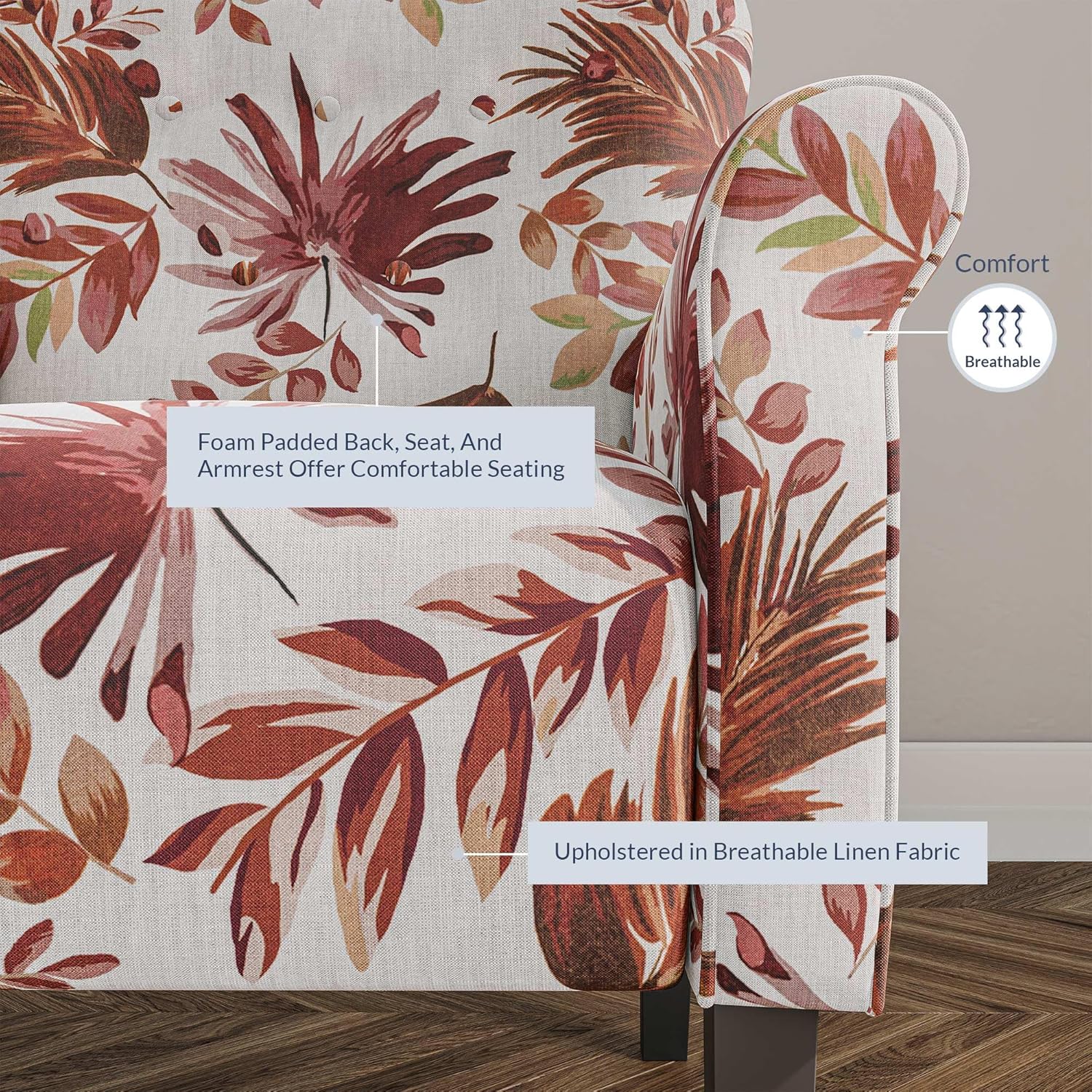 - [MODERN & FLORAL DESIGN] The plush red floral upholstery with bold designs adds texture to the decor to create more visual interest. Modern accent chair is ideal for reading or relaxing in the comfort of your sunroom, living room. A welcoming addition to your home,completes the space perfectly!