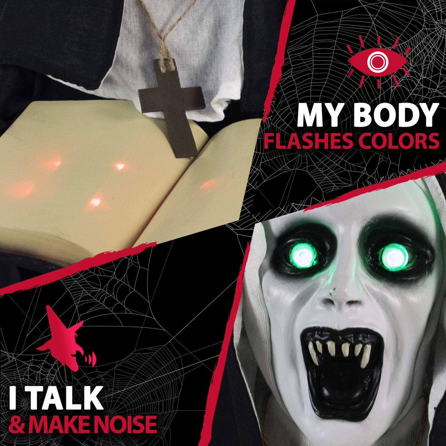 Haunted Hill Farm Life-Size Scary Talking Witch Nun Halloween Animatronic with Touch Activated Lights and Sound, Poseable, Battery Operated Indoor or Covered Outdoor Creepy Halloween Decorations