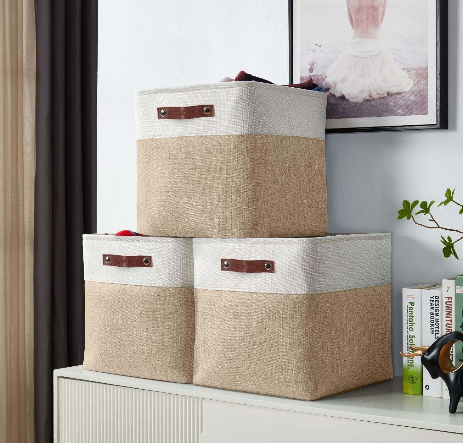 - Durable Cubes Design: DECOMOMO's storage bins feature a sturdy metal frame, extra thick EVA exterior, polyester interior, 2.5mm MDF fiberboard bottom, and faux leather handles capable of holding up to 25 lbs.