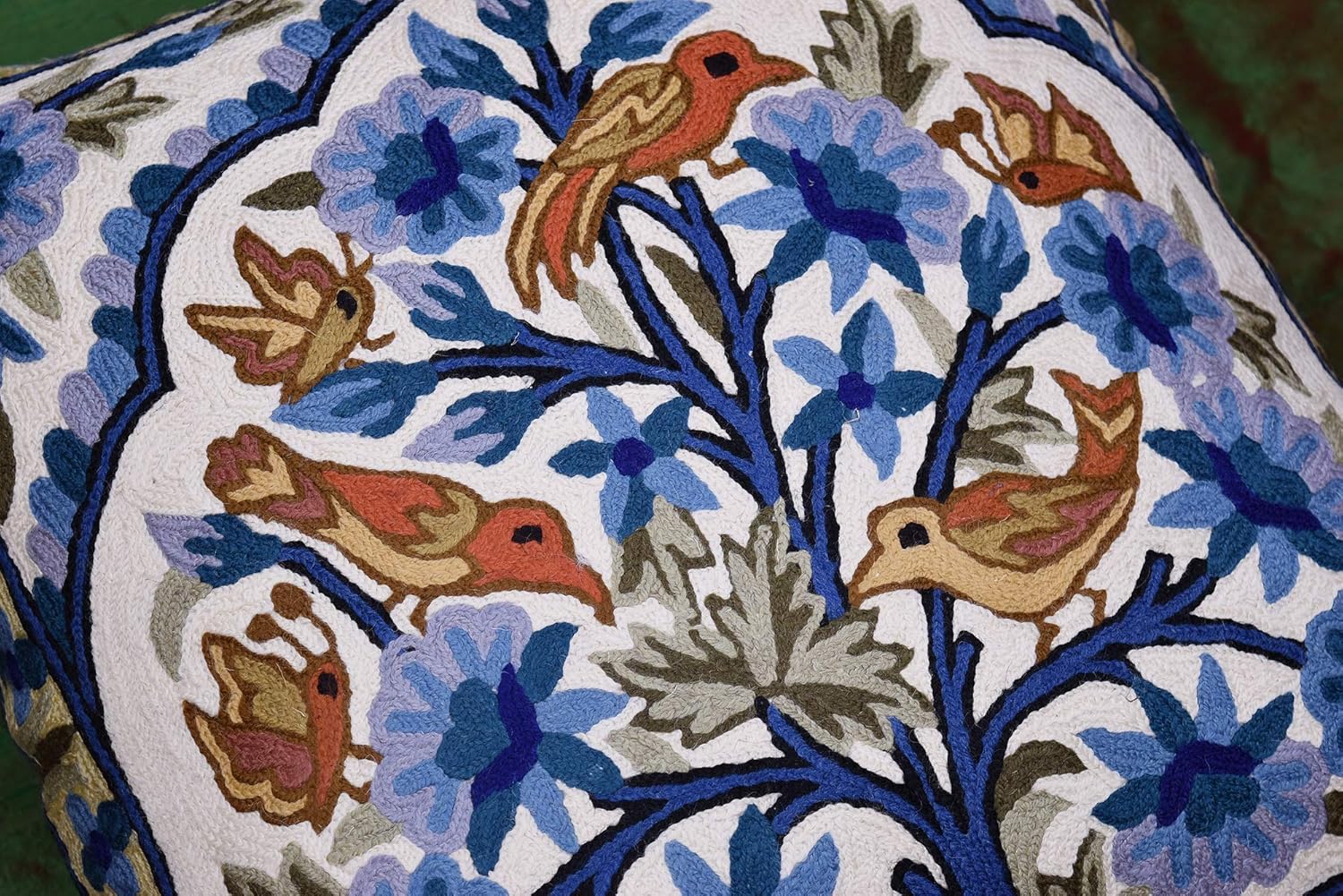 Blue Tree of Life Pillow Cover Blues Birds Floral Decorative Pillowcase Flower Outdoor Suzani Cushion Needlepoint Hand Embroidered Wool Size - 18x18