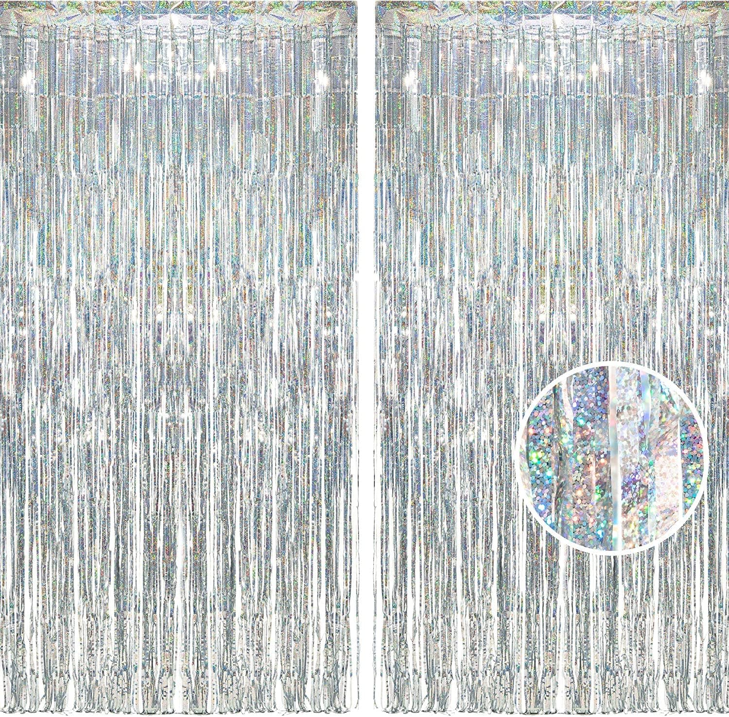 - The beautiful silver tinsel backdrop curtain is good for adding shiny atmosphere as decorations for parties, like 25th Birthdays Party, Bachelorette Party, Engagement Party, Bridal Shower Party, 60th Anniversary Party, Motherâs Day Party, Valentineâs Day, Prom Party, Homecoming Party, Theme Party, Christmas Party, Halloweens Party, New Years Eve Party and more. They are also suitable for ceremony, celebration, stage backdrop, dance backdrop etc.