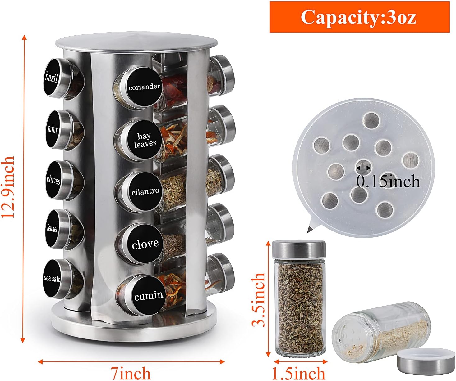 - 【Safe & Durable Material】Our revolving spice rack with jars is made of high quality stainless steel, strong and durable. The glass jar is made of lead-free glass, which is safe and secure to store the spices, and the transparent jar body is convenient for observing the spices.