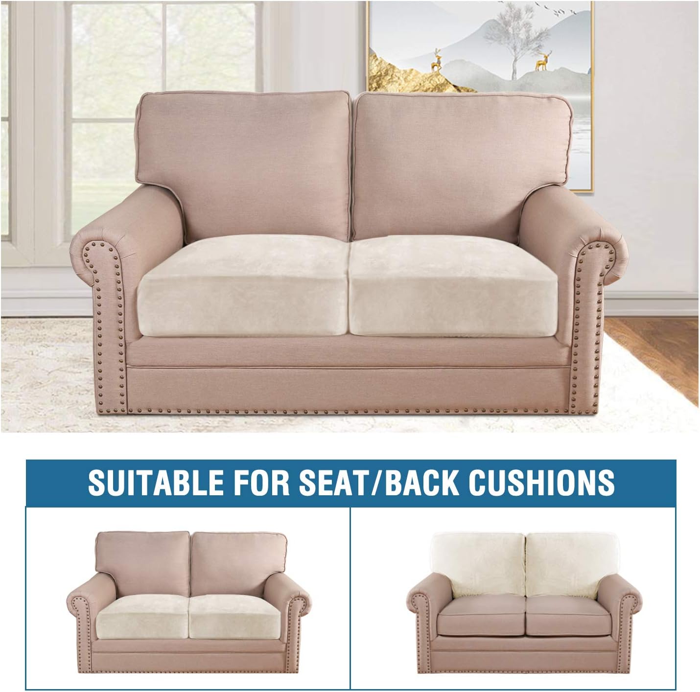 H.VERSAILTEX Velvet Stretch Couch Cushion Cover Plush Cushion Slipcover for Chair Loveseat Sofa Cushion Furniture Protector Seat Cushion Sofa Cover (2 Piece Medium Sofa Cushion Covers, Ivory)
