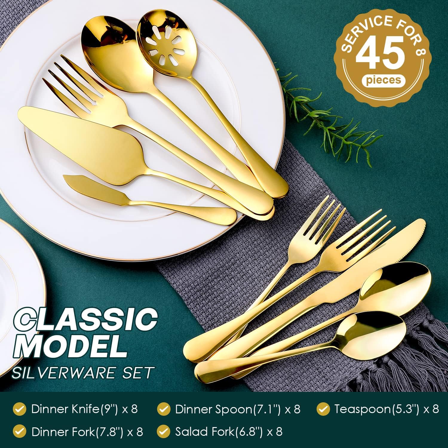 - ă45 PIECES GOLD SILVERWARE SET FOR 8ăOGORI 45-piece gold silverware set includes 8 dinner knives, 8 dinner forks, 8 dinner spoons, 8 tea spoons, 8 salad forks and 5-piece nice serving set ( 1 serving spoon, 1 serving fork, 1 pie server, 1 butter knife, 1 slotted serving spoon)