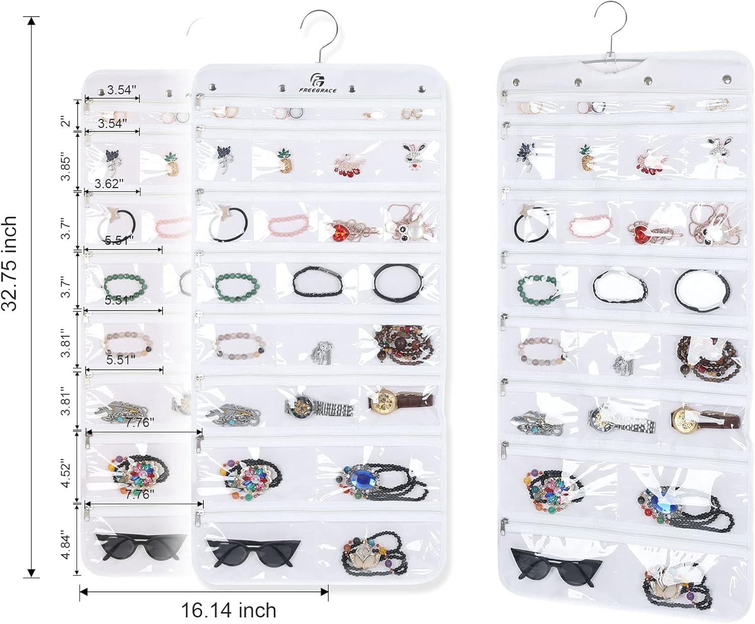 - QUALITY MATERIALS: Freegraceās sturdy hanging jewelry organizer is made of 600D polyester Oxford fabric and has a PU backing (SIZE: 32.7āā x 16.5āā). The pockets are made of transparent PVC to allow you to see through to the stored jewelry, and the zipper and revolving metal hanger are well-made and durable.