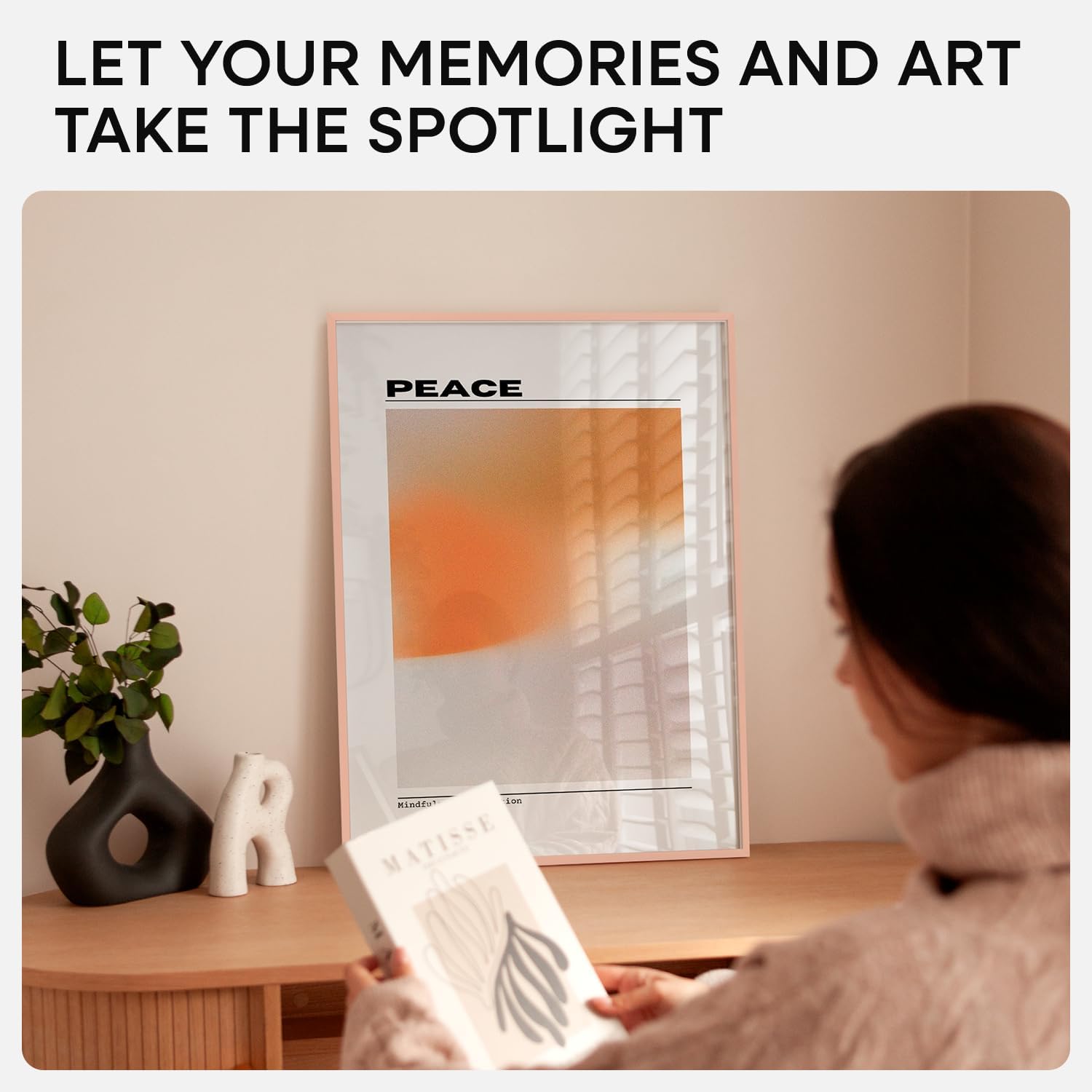 - ROSE GOLD. SOFT GLOW. This aluminum frame features a muted rose finish with a satin texture. It brings gentle contrast to light walls and softens modern interiors with a hint of warmth.