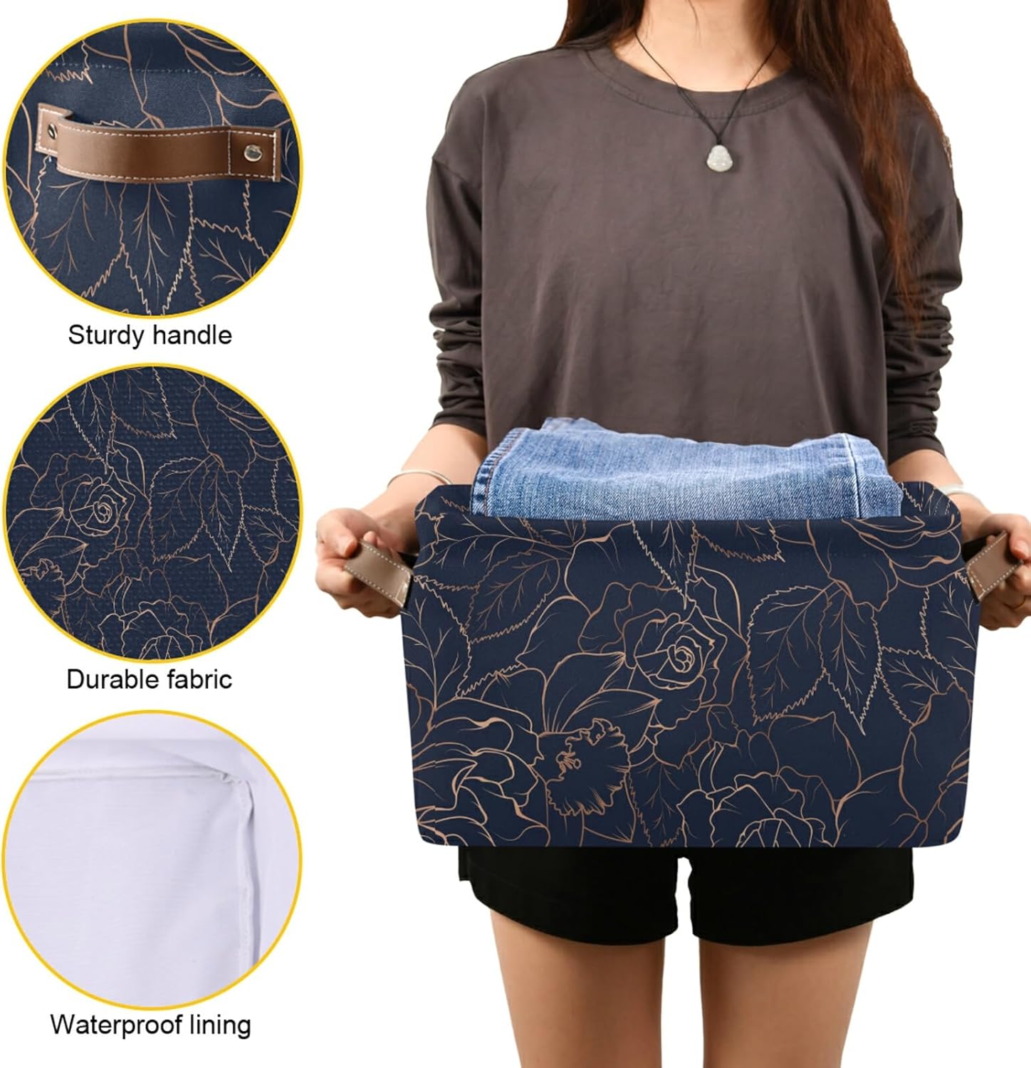 susiyo Large Foldable Storage Bins Collapsible Decorative Fabric Storage Baskets with Leather Handles for Home Closet Bedroom Organizer Nursery 2 Pack,Navy Blue