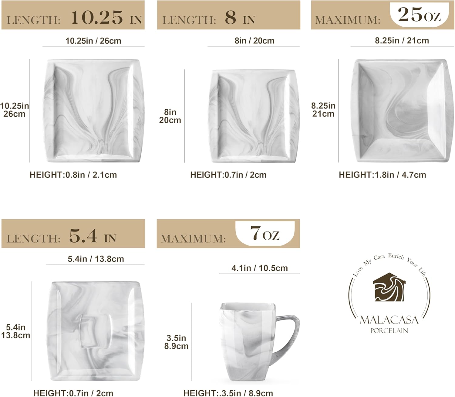 - Stylish & Low Maintenance -- Featured with a low profile square design, and exquisite natural marble lines, each marble dish set are distinct, perfect for any casual or formal dining occasions; Square dinnerware sets are designed to provide the best dining experience while requesting low maintenance, saves you time and effort in upkeep.