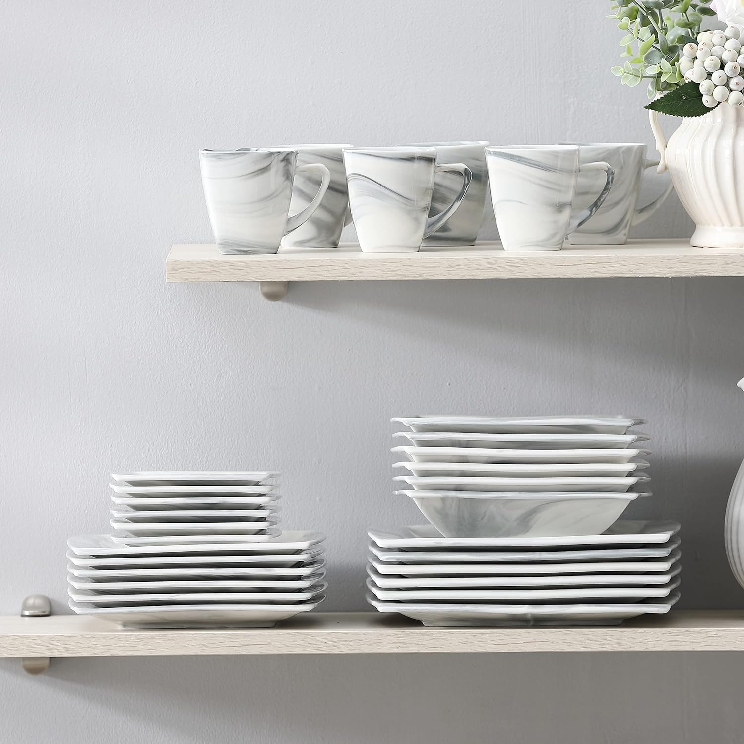MALACASA Dinnerware Sets, 30 Piece Porcelain Plates and Bowls Sets for 6, Square Dish Set with Dinner Plates Set, Cup and Saucer, Modern Dishware Dishes Microwave Safe, Marble Grey, Series Blance