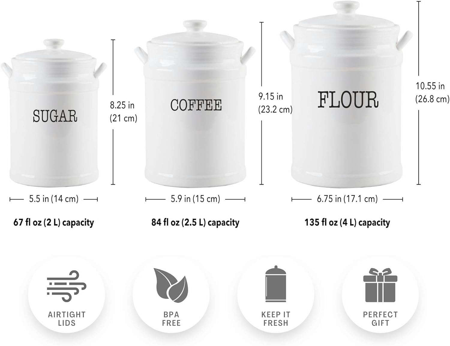 - Complete Set: Our ceramic canister pack includes a flour canister (135oz), coffee canister (84oz), and sugar canister (67oz). The set comes in special packaging so each accessory will arrive safely at your doorstep.
