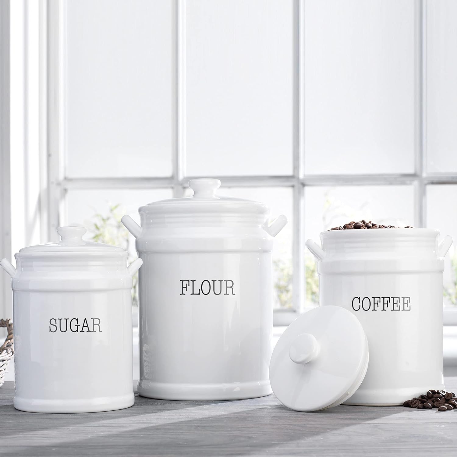 - Made to Last: These white kitchen canisters are made of ceramic, a durable and long-lasting material that will pass the test of time. The flour sugar canister set has a glossy design with a classic white finish for a French-chic look.