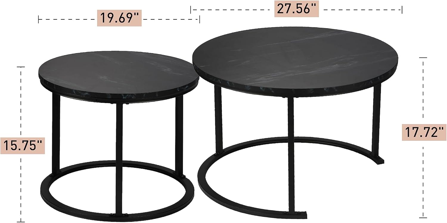 Round Modern Nesting Coffee Table Set of 2,Waterproof Faux Marble Wood Top & Metal Frame and Easy Assembly for Living Room,Office,Balcony (Black+Black
