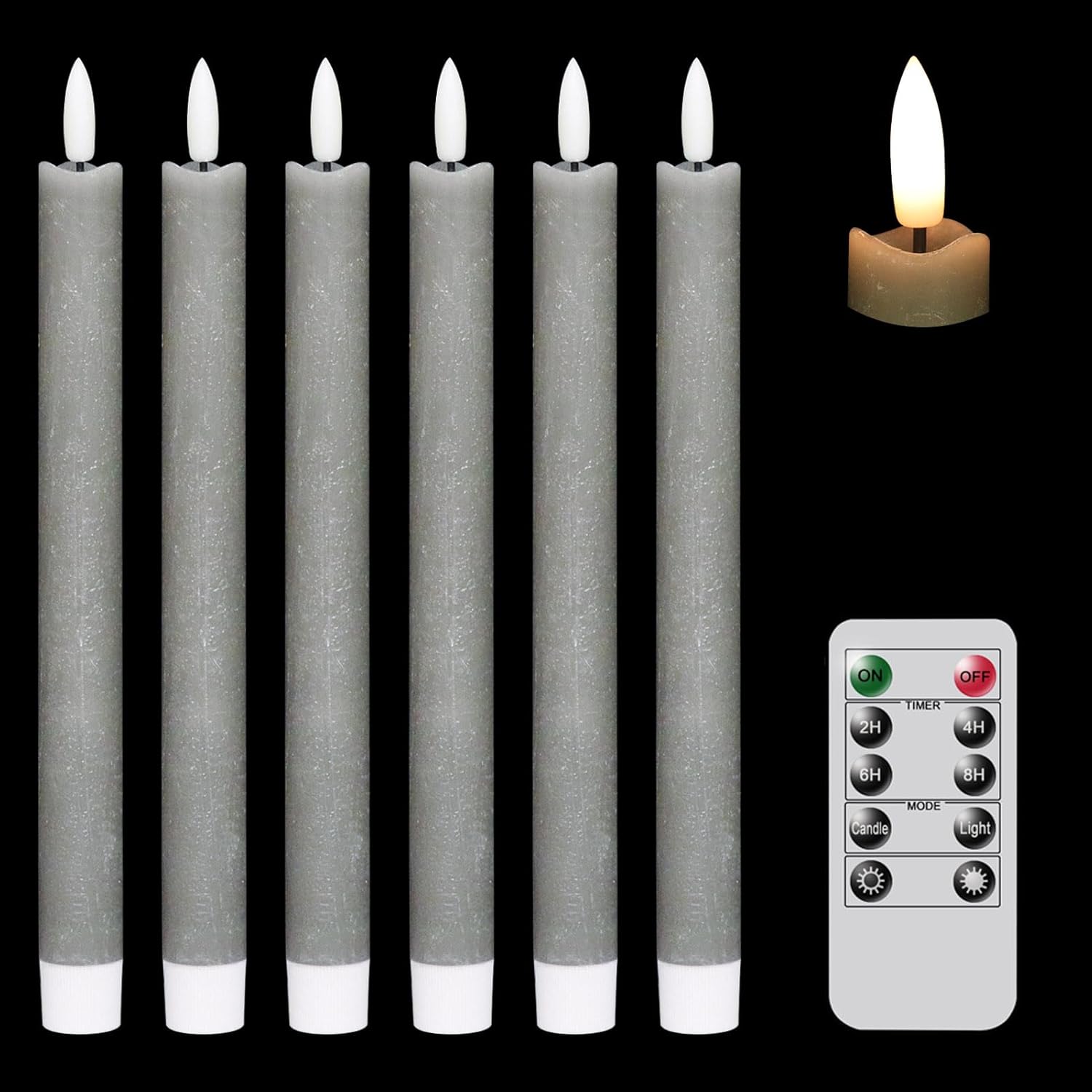GenSwin Flameless Grey Taper Candles Flickering with 10-Key Remote, Battery Operated Led Warm 3D Wick Light Window Candles Real Wax Pack of 6, Christmas Home Wedding Decor(0.78 X 9.64 Inch)