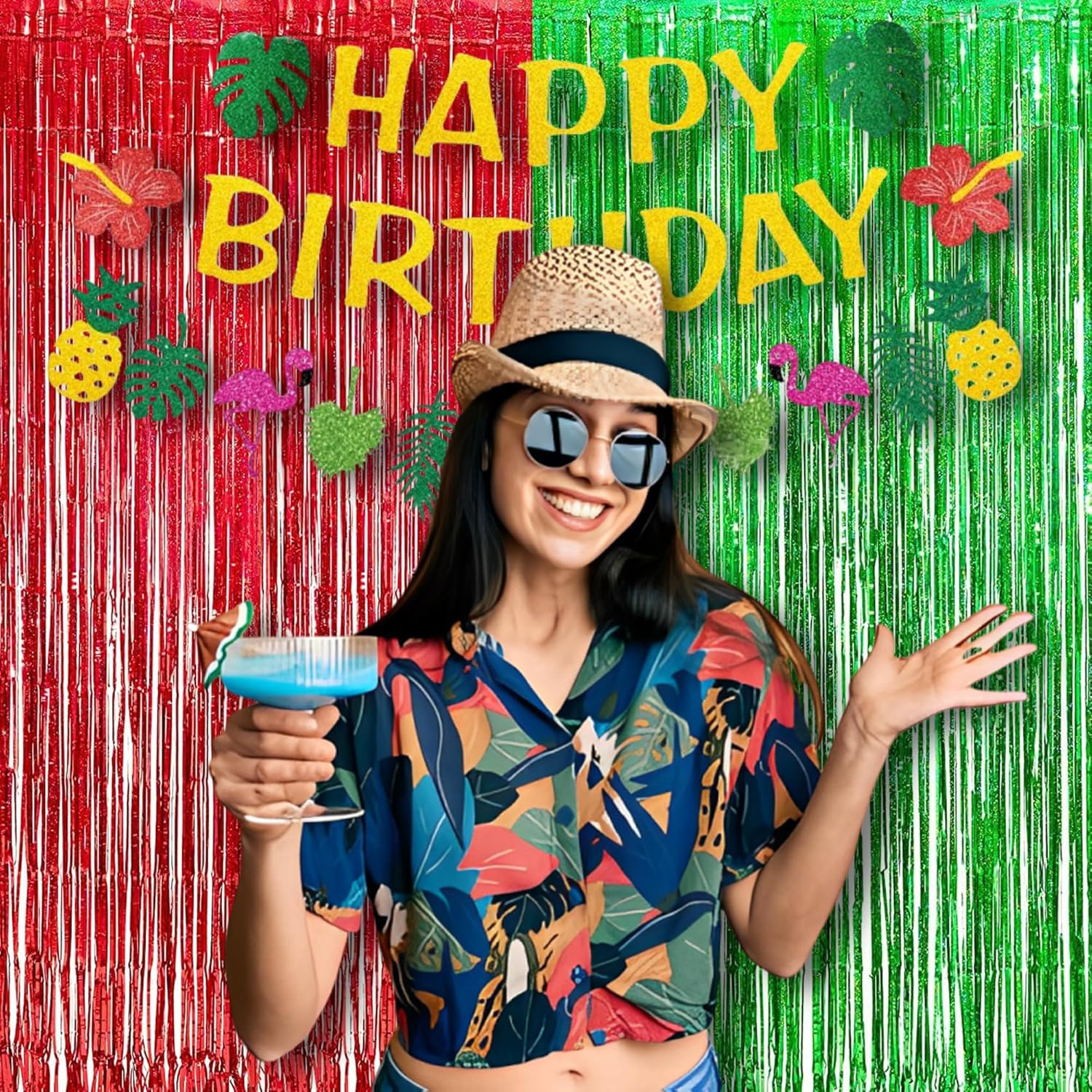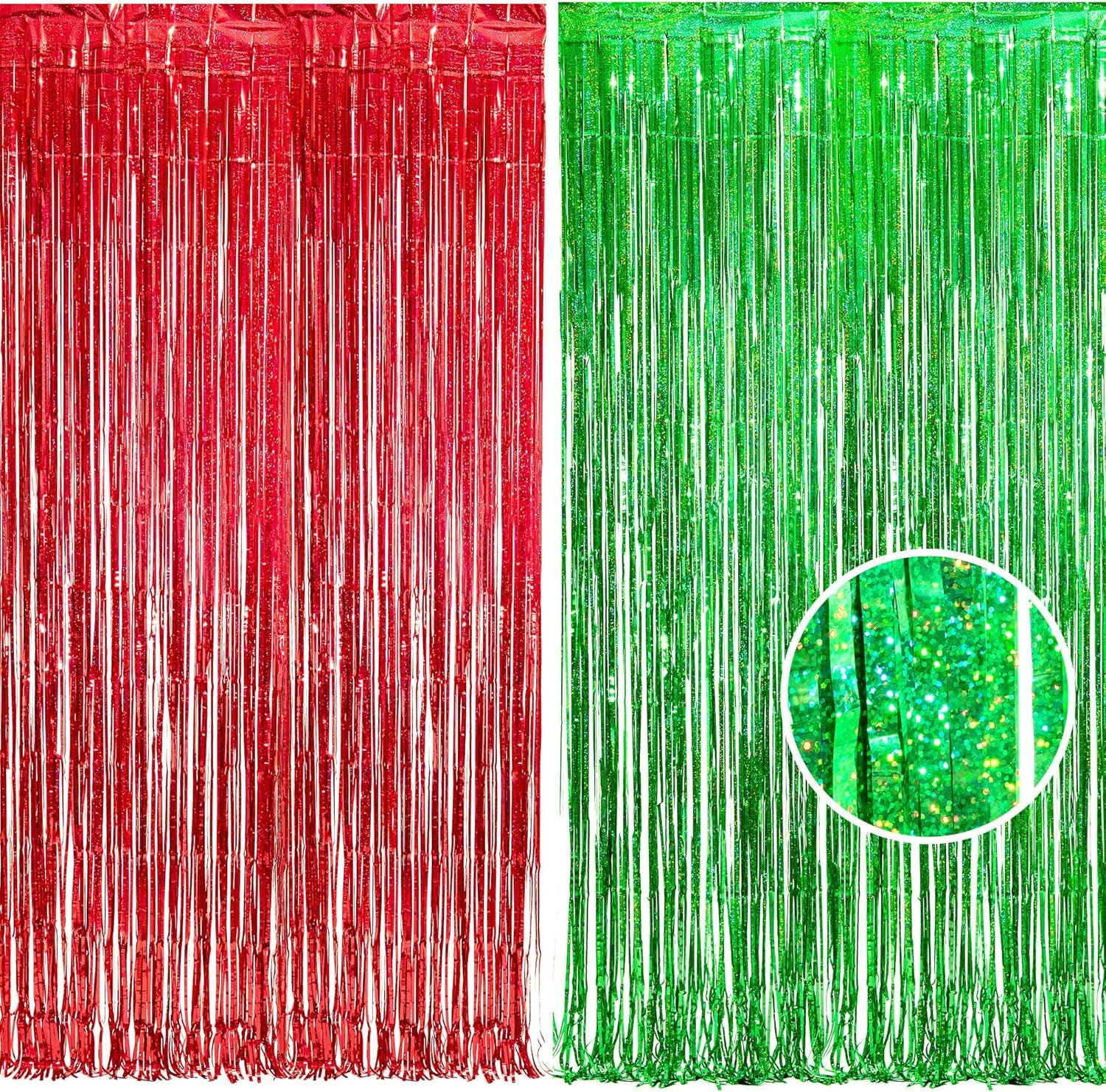 BRAVESHINE Tinsel Foil Fringe Curtains - 2 Pack 3.2 x 8.2 ft Metallic Photo Booth Streamer Backdrops for Birthdays Fiestas Melons Hawaiian Luau Tropical-Theme Christmas Party Decorations - Red Green