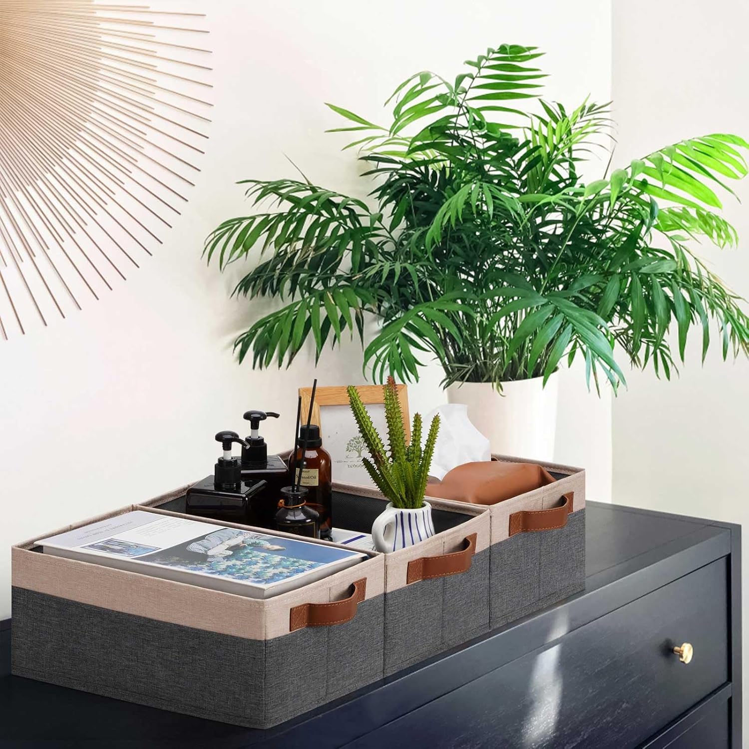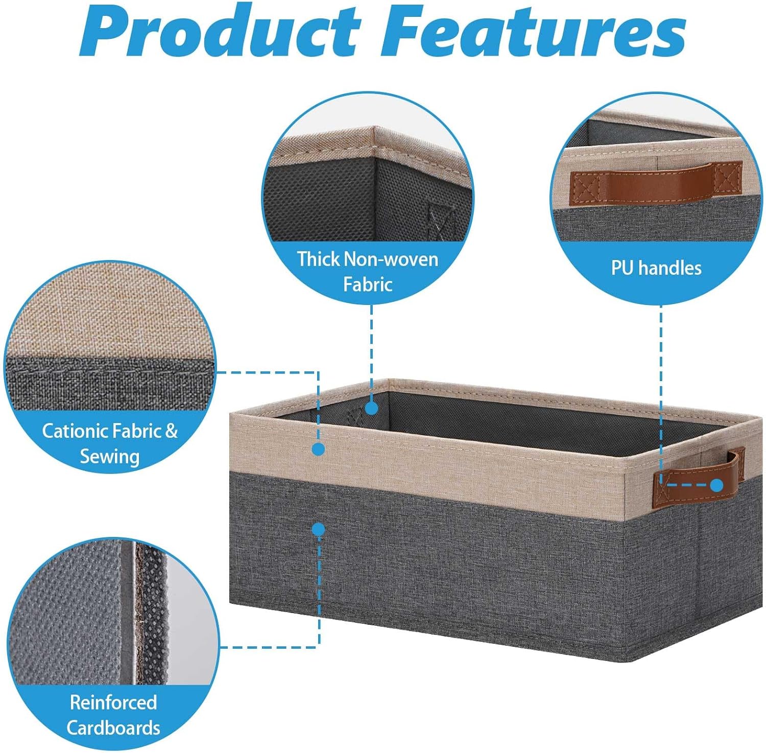 - 👍【QUALITY MATERIAL】Storage baskets for shelves are made of high-quality cationic fabric and polyester cotton fabric, and the inner layer is made of non-woven fabric, which is odorless, long-lasting and strong. Classic faux leather handles that adds a comfortable touch and provides a strong and comfort grip to pull and move. Fabric storage bin is easy to clean, just wipe with a damp sponge or cloth