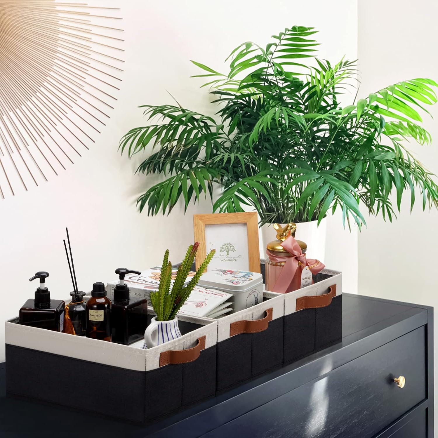 - 👍【QUALITY MATERIAL】Storage baskets for shelves are made of high-quality cationic fabric and polyester cotton fabric, and the inner layer is made of non-woven fabric, which is odorless, long-lasting and strong. Classic faux leather handles that adds a comfortable touch and provides a strong and comfort grip to pull and move. Fabric storage bin is easy to clean, just wipe with a damp sponge or cloth