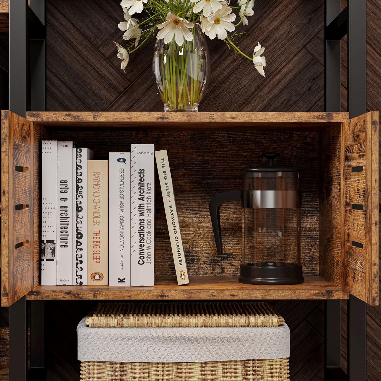 IRONCK Industrial Bookshelf and Bookcase with 2 Louvered Doors 5 Tiers Triple Wide Display Shelf with Storage Cabinet for Living Room Home Office
