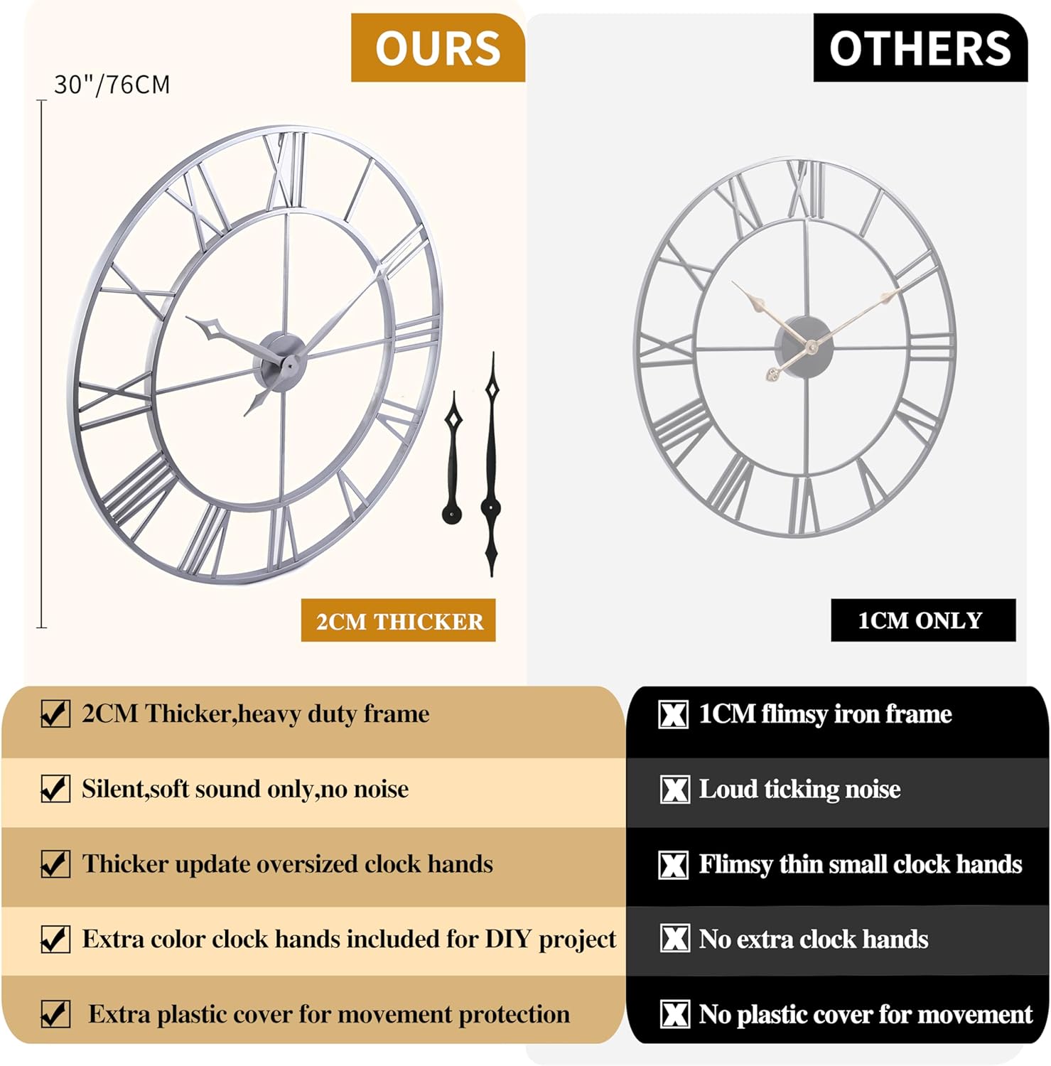 - [Easy to Read and Hang]-30" (75cm) Oversized large Roman numerals in contrast with aluminum large hands for easily reading. Simple design with a good performance. Package Comes with 1 set extra black color interchangeable Clock Handsďźalso included Invisible Nail Hangers for hanging