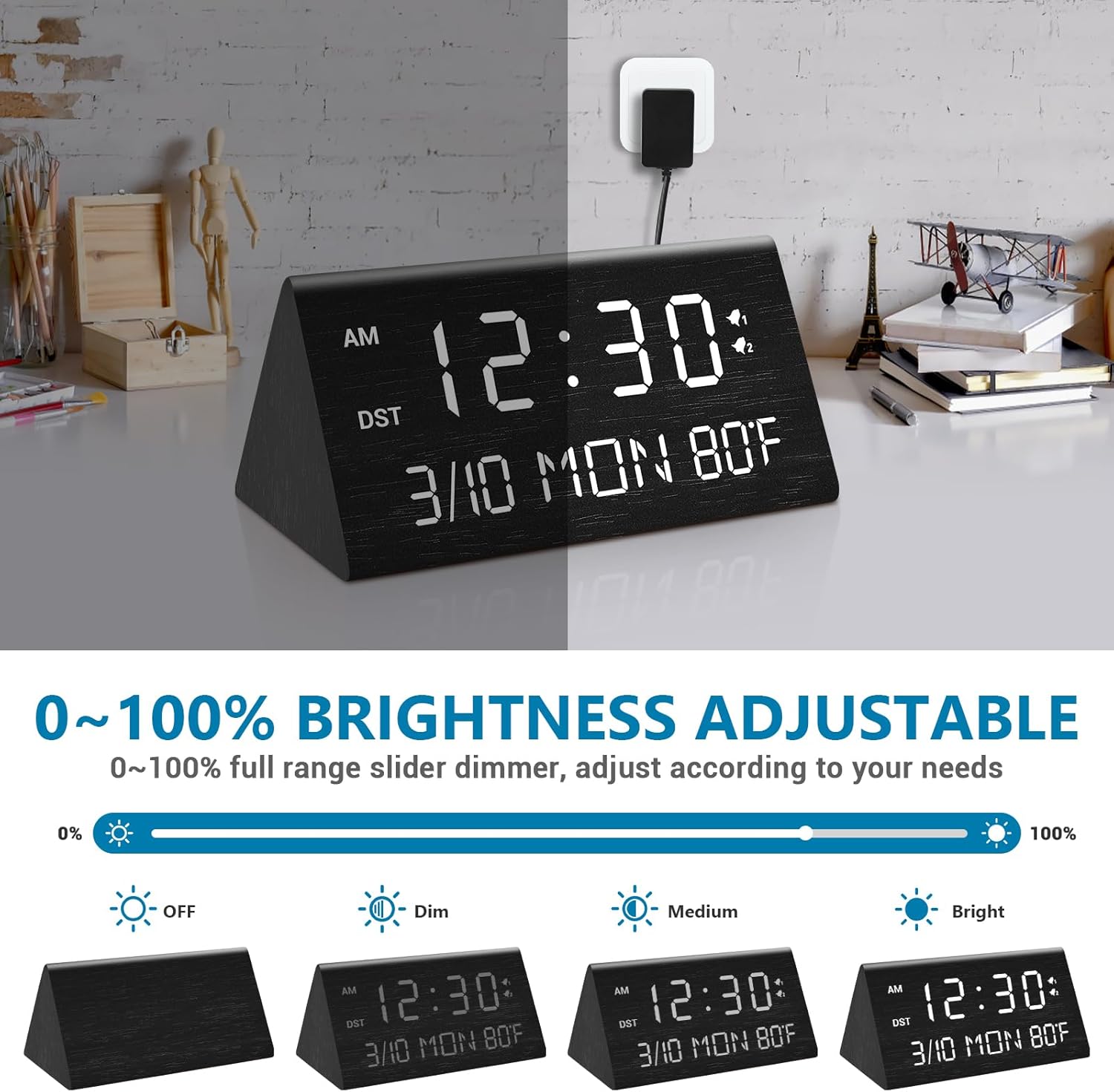 - â°ă5 Level Brightness Adjustable alarm clockă- Compared with the alarm clocks on the market that only have three levels of brightness adjustment, this wooden alarm clock is upgraded to 5-level dimming. Customers can adjust the brightness to 5 percentileďź0, 20%, 40%, 60%, 80%, 100%ďź, which solves the problem of too bright display at night and helps you fall asleep better.