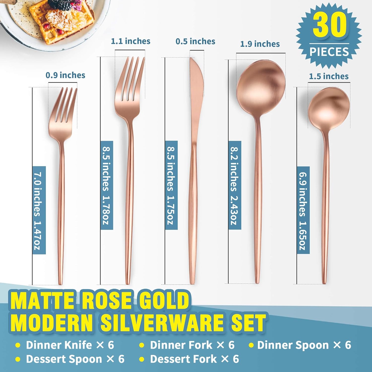 - SERVICE FOR 6 : 30 piece silverware set includes 6 dinner knives, 6 dinner forks, 6 dinner spoons, 6 dessert forks, 6 dessert spoons