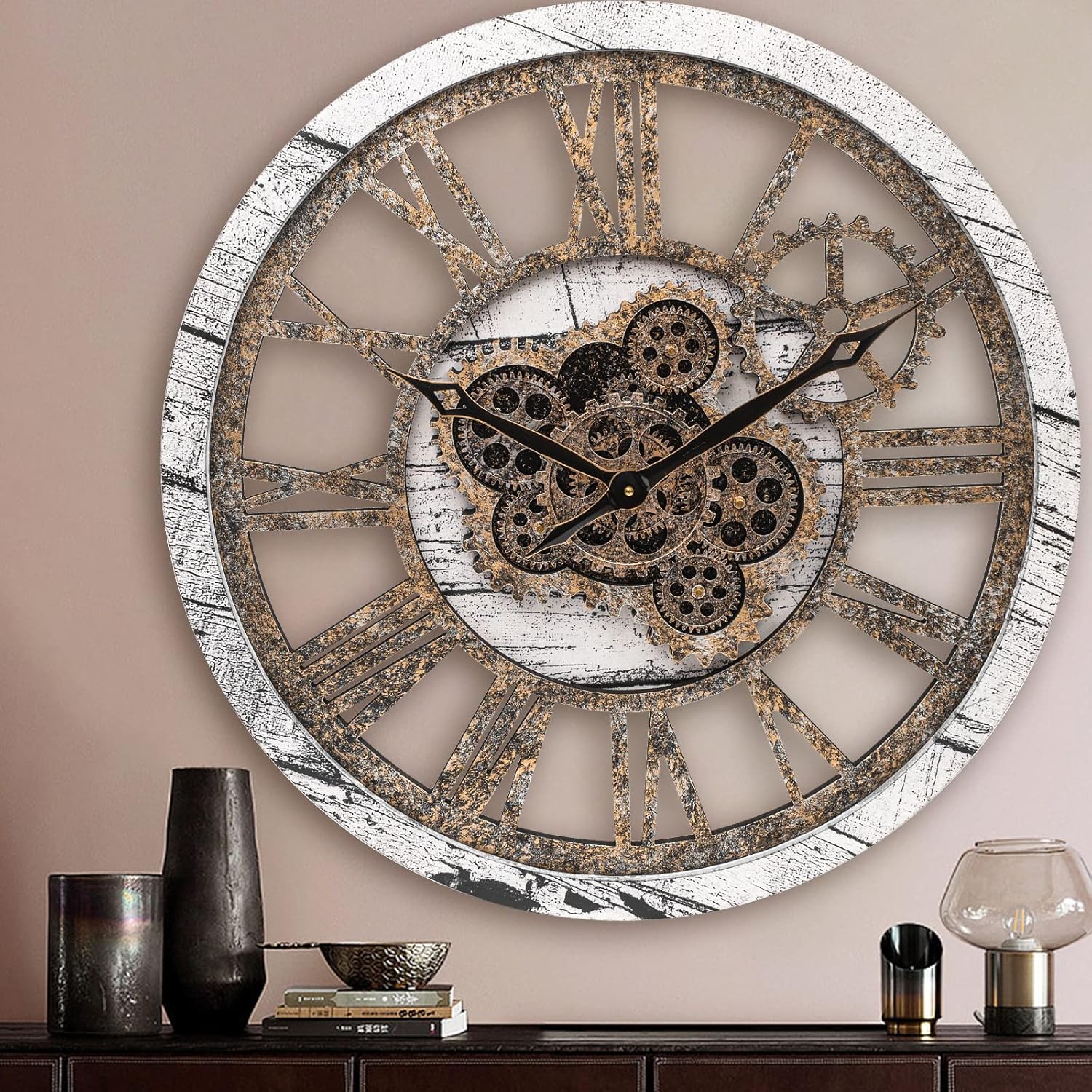 HOIBAI Large Wall Clock, 20 Inch Wall Clocks for Living Room Decor Farmhouse Vintage Rustic Kitchen Wall Decor Vintage Roman Big Oversized Wall Clock for Home Bedroom House Office, Moving Gears Clock