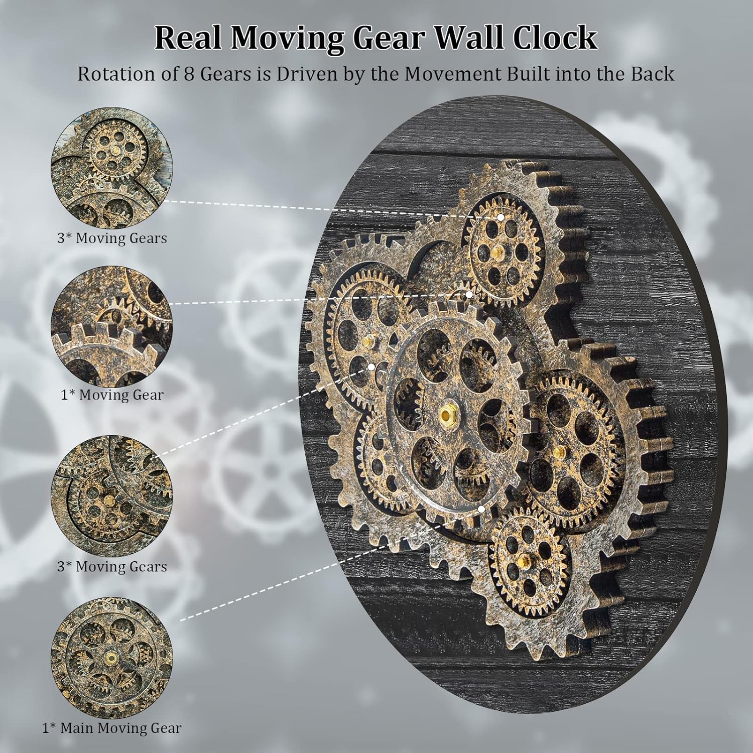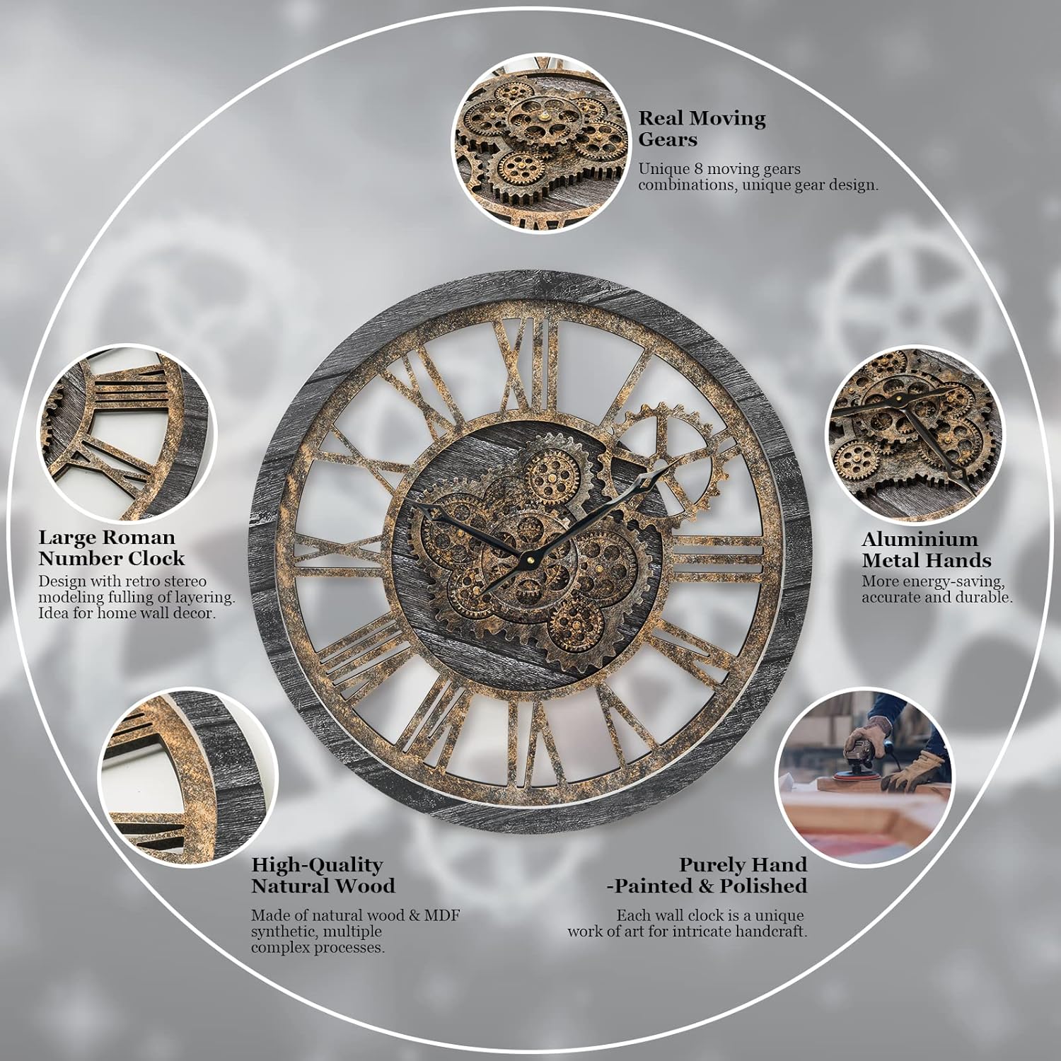• 【Real Moving Gear Clock】All gears for the wall clock are real moving! Design with rustic bronze-color and industrial style. An creative combination of four gears for a retro look, has a very exquisite decorative effect makes the wall clock become a chic art works. The large wall clock crafted of nature wood & MDF. Big roman numeral numbers and wood rustic moving gears perfect for any room decor.