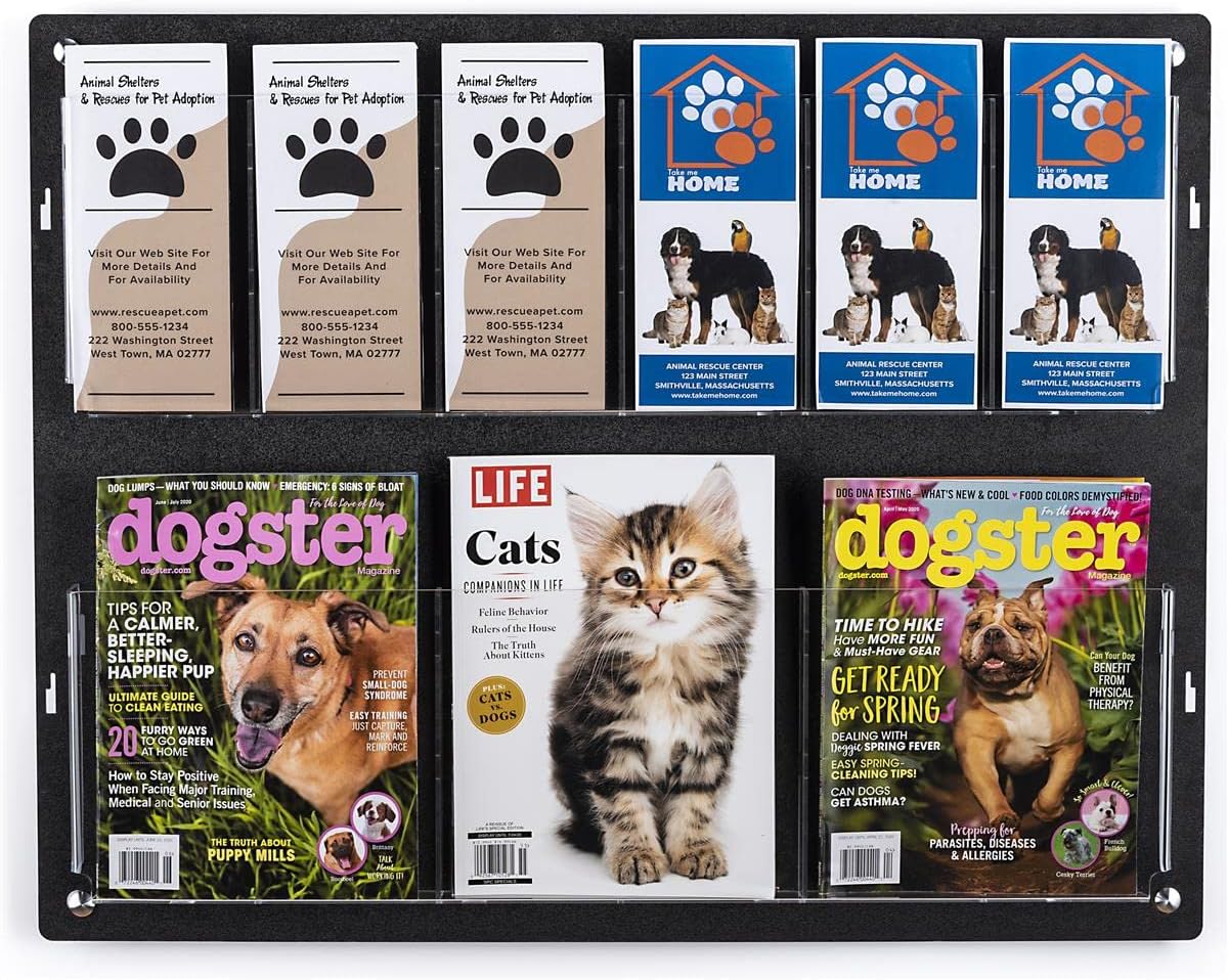 Displays2go Tiered Brochure Rack for Wall, 6-12 Adjustable Pockets, Frameless Acrylic - Black (2RP6BLK)