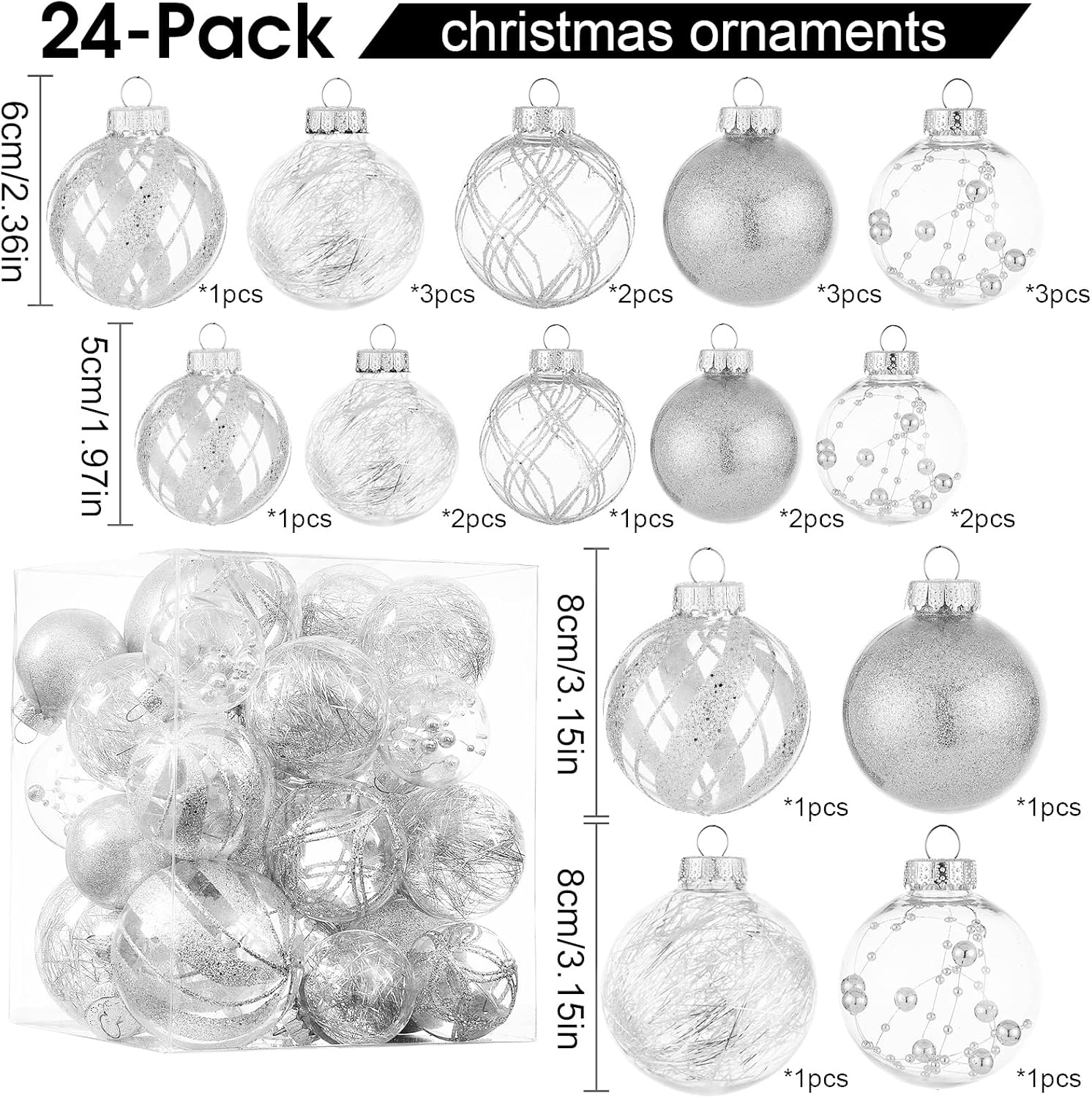 - Silver Christmas Ball Ornaments--These 24ct clear Christmas decorations are made of durable and environmentally friendly plastic with excellent shatter resistance. These Christmas balls have shiny decorations and a transparent glaze base, which are perfect for hanging on your Xmas tree and decorating your Home with them,this will become part of your vacation.