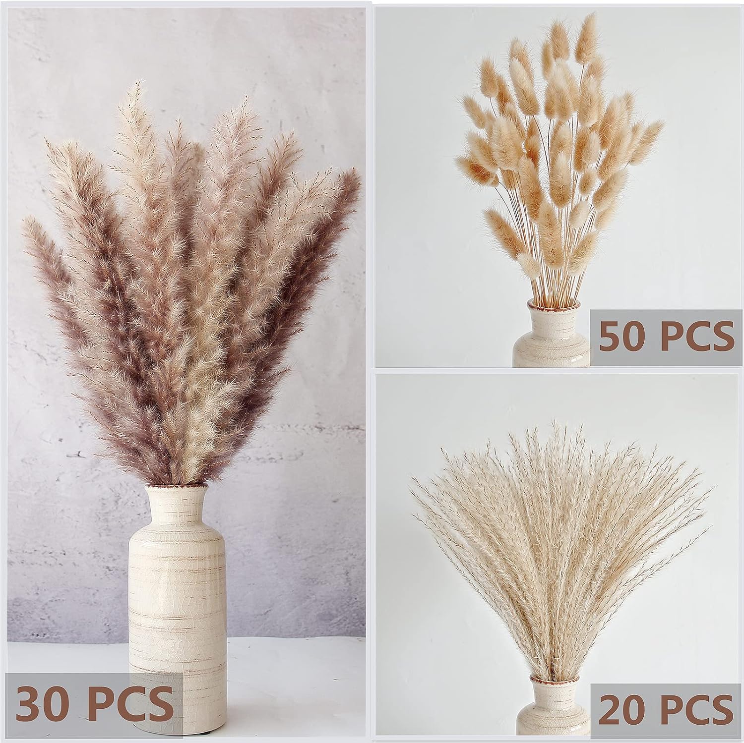 - More then one kind of pampas grass : carefully selected natural dried pampas grass decor, try to avoid deformation and breakage of dried pampas grass, 100 pieces of pampass grass contain 50 small pampas grass, 20 reed grass, 30 brown pampas grass decor, (pampas grass vase not included) fill your vase, you can match it with different fall decor floral bouquets according to your preferenc