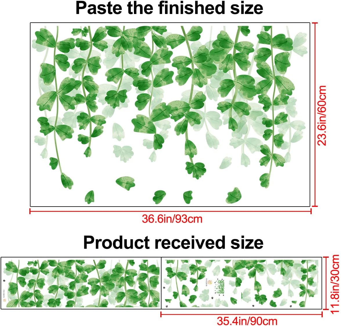 - The green vine decals on the wall is really great decorations for any smooth wall or window decorations, holiday party supplies. Add some color to your room, create a cute and lively atmosphere. Finished Size: 36.6” x 23.6” / 93cm x 60cm. This green vine leaf wall decals include 2 sheets. Each size: 12” x 36” / 30cm x 90cm.